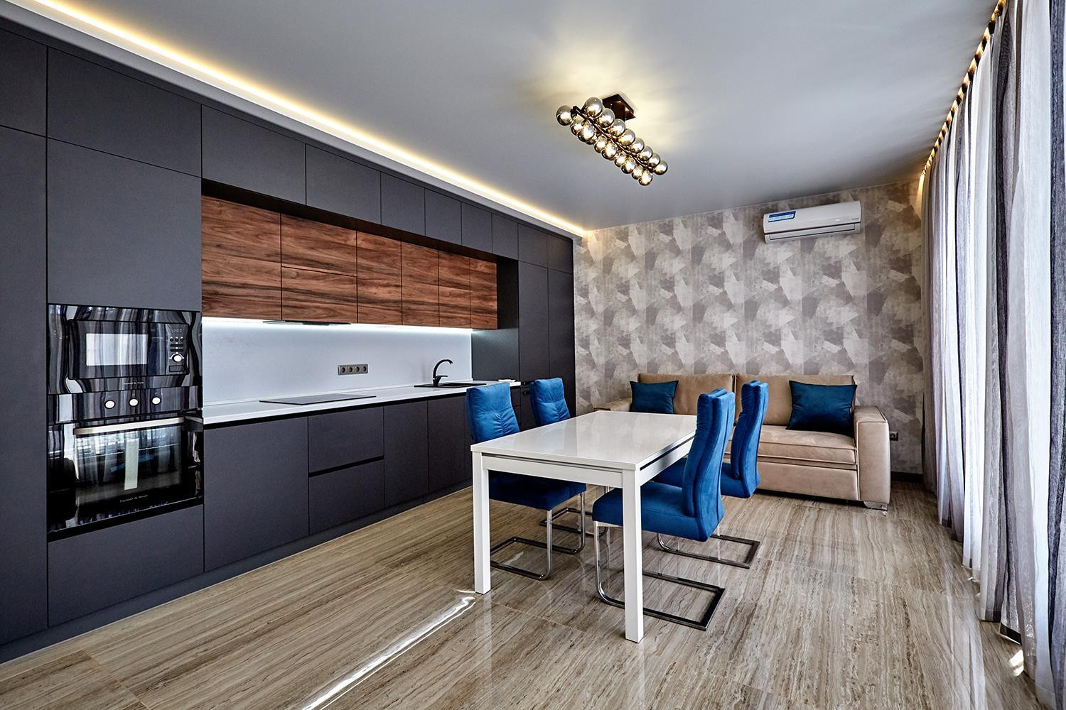 Очень удобная планировка: 3 жилые комнаты и кухня–гостиная. Шикарная кухня оборудована новейшей техникой - любая хозяйка будет в восторге, оказавшись на этой кухне. Просторная, светлая спальня. И комнаты, которые можно превратить как в детские, так и в комнаты для гостей. Санузел в дорогостоящем кафеле, который прослужит очень много лет.