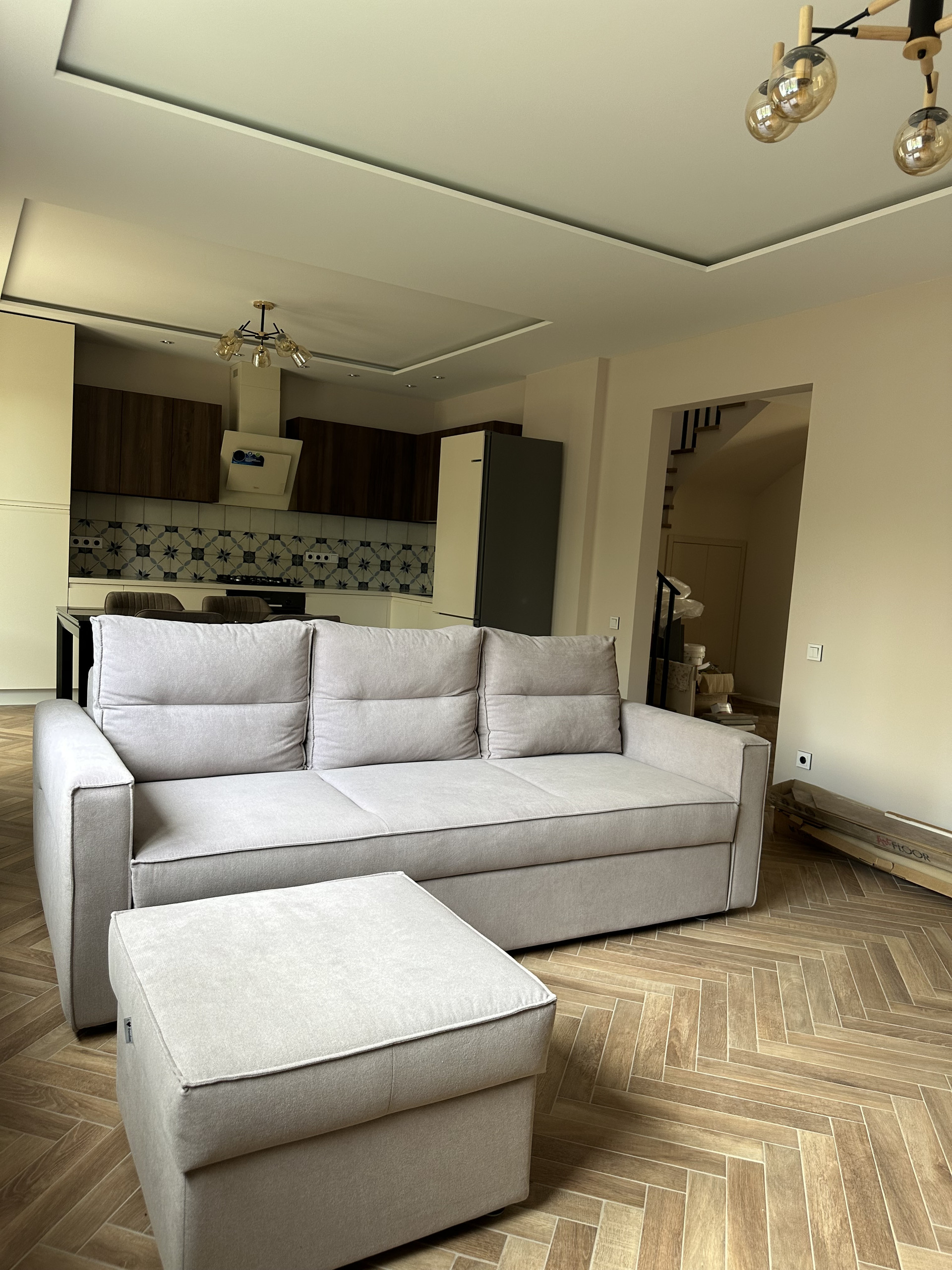 - на полу плитка-елочка
