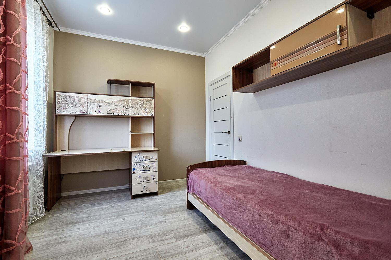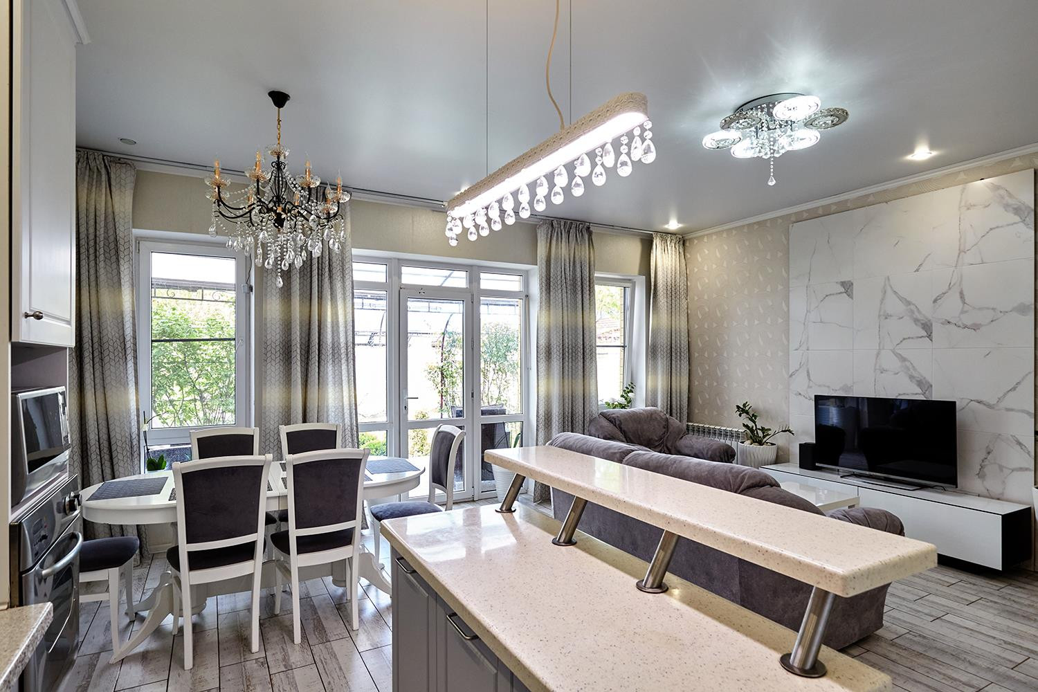 Удачная планировка дома, комнаты с высокими потолками 3м, большая светлая кухня-гостиная с дополнительными двумя окнами с северной стороны и кабинет. Панорамные окна, южные окна с УФ напылением, большая прихожая с удобной, 5 комнат (гостиная-студия 36 м. кв., кабинет, 3 спальни), 2 санузла (душевая, ванна), тёплые полы – кафель и ламинат. Натяжные потолки с точечным освещение. Лестница из бука. 3 сплит. Системы. Ремонт в белых тонах мягкая мебель (частично), люстры, бытовая техника, детали интерьера (частично), шторы, комнатные растения.