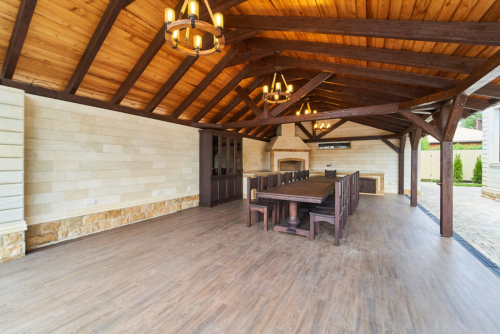 Свежая постройка: основной дом в двух уровнях, площадь около 400 м2, есть выход в банный комплекс с большим закрытым бассейном, три изолированные спальни, место под рабочий кабинет, огромная кухня-гостиная, имеется несколько санузлов, витражное остекление и камин, отдельный вход в котельную. Домовладение расположено на вместительном участке с хорошим фасадом около 50 метров и большой придомовой территорией для парковки нескольких автомобилей. Во дворе гостевой дом с несколькими спальнями и своей кухней, закрытая веранда для приема гостей и открытая зона барбекю с большим красивым деревянным столом и мангалом выложенным кирпичом.