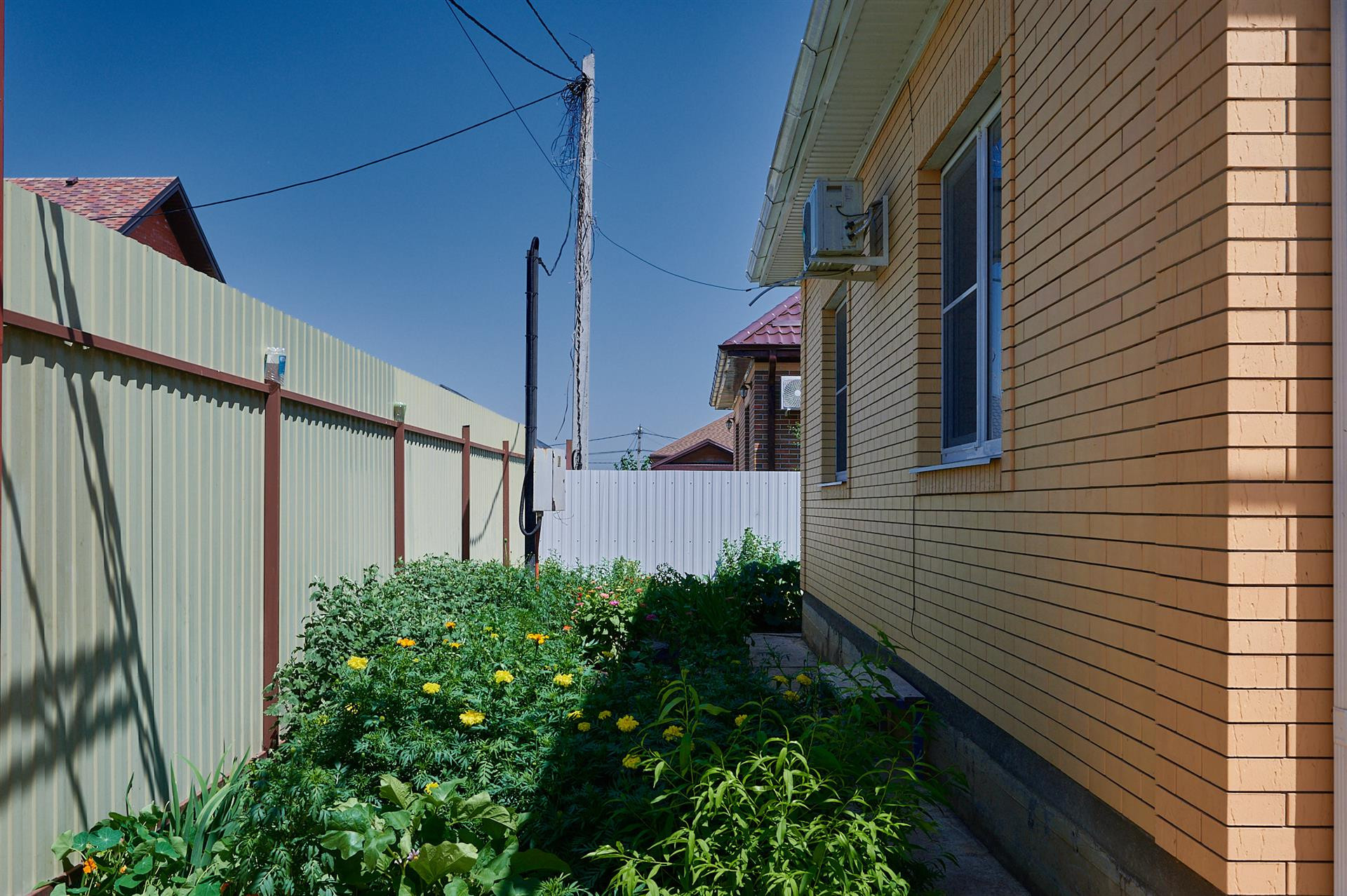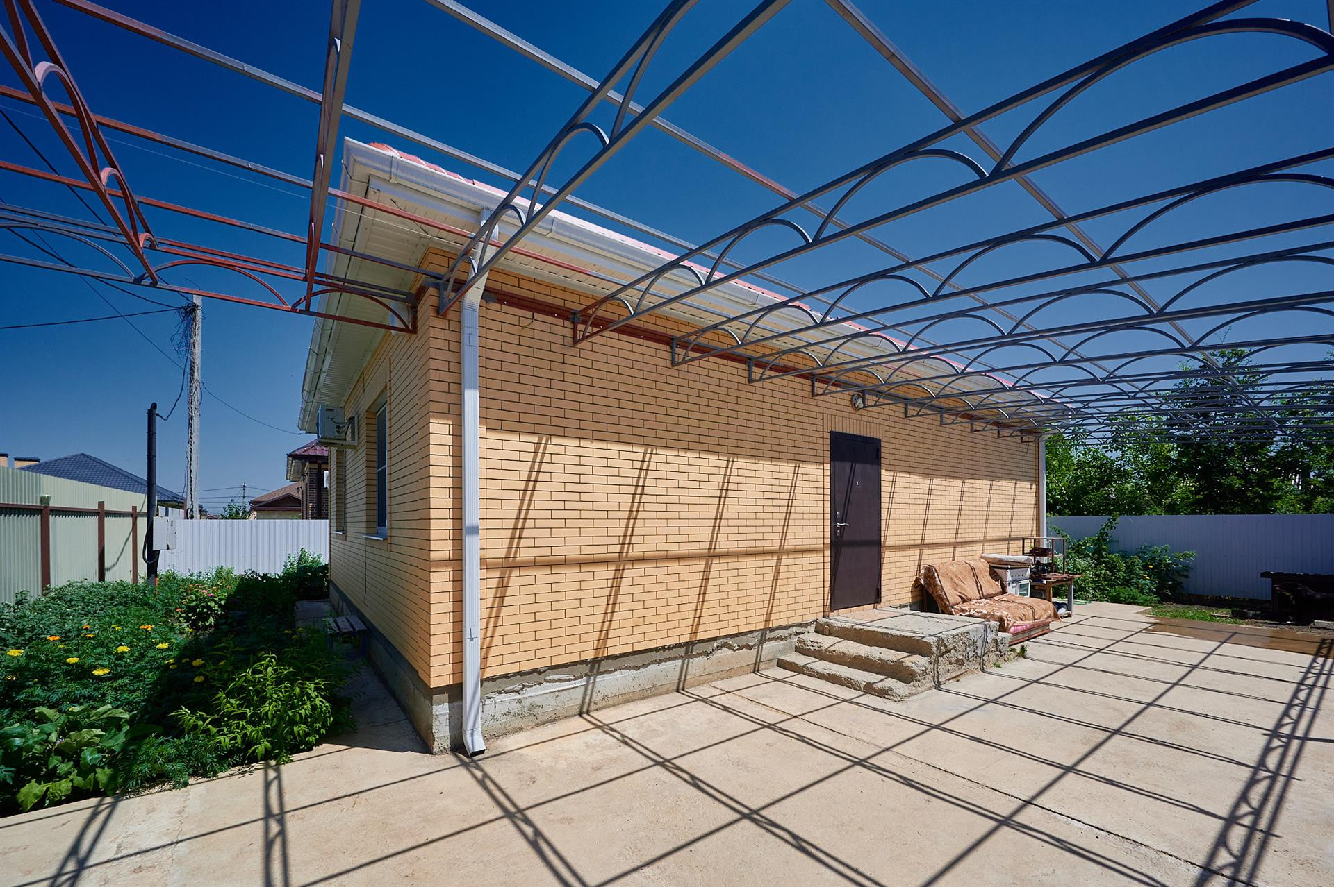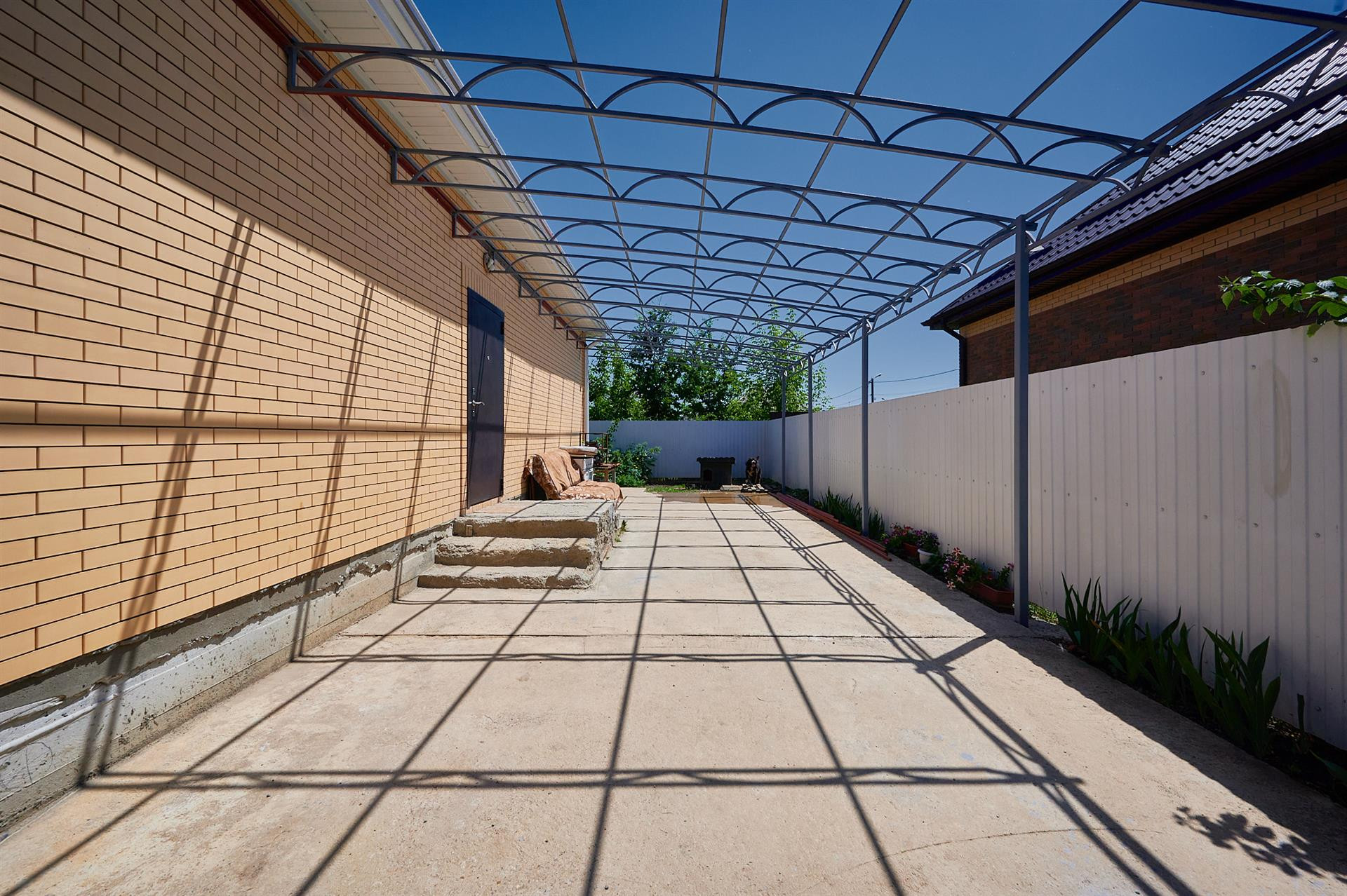Сделан навес, хватает на три машины во дворе. Откатные ворота, кирпичный забор.