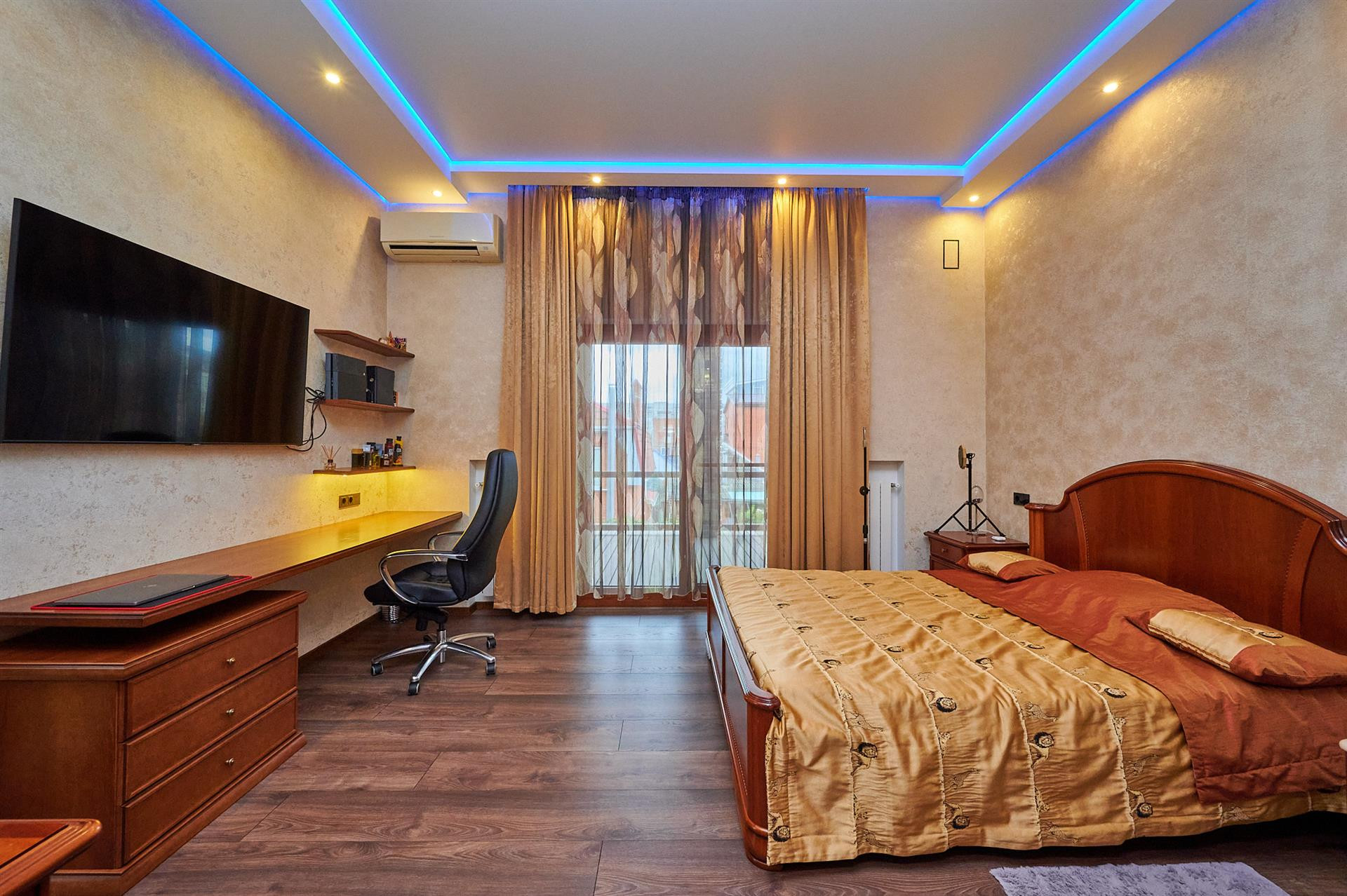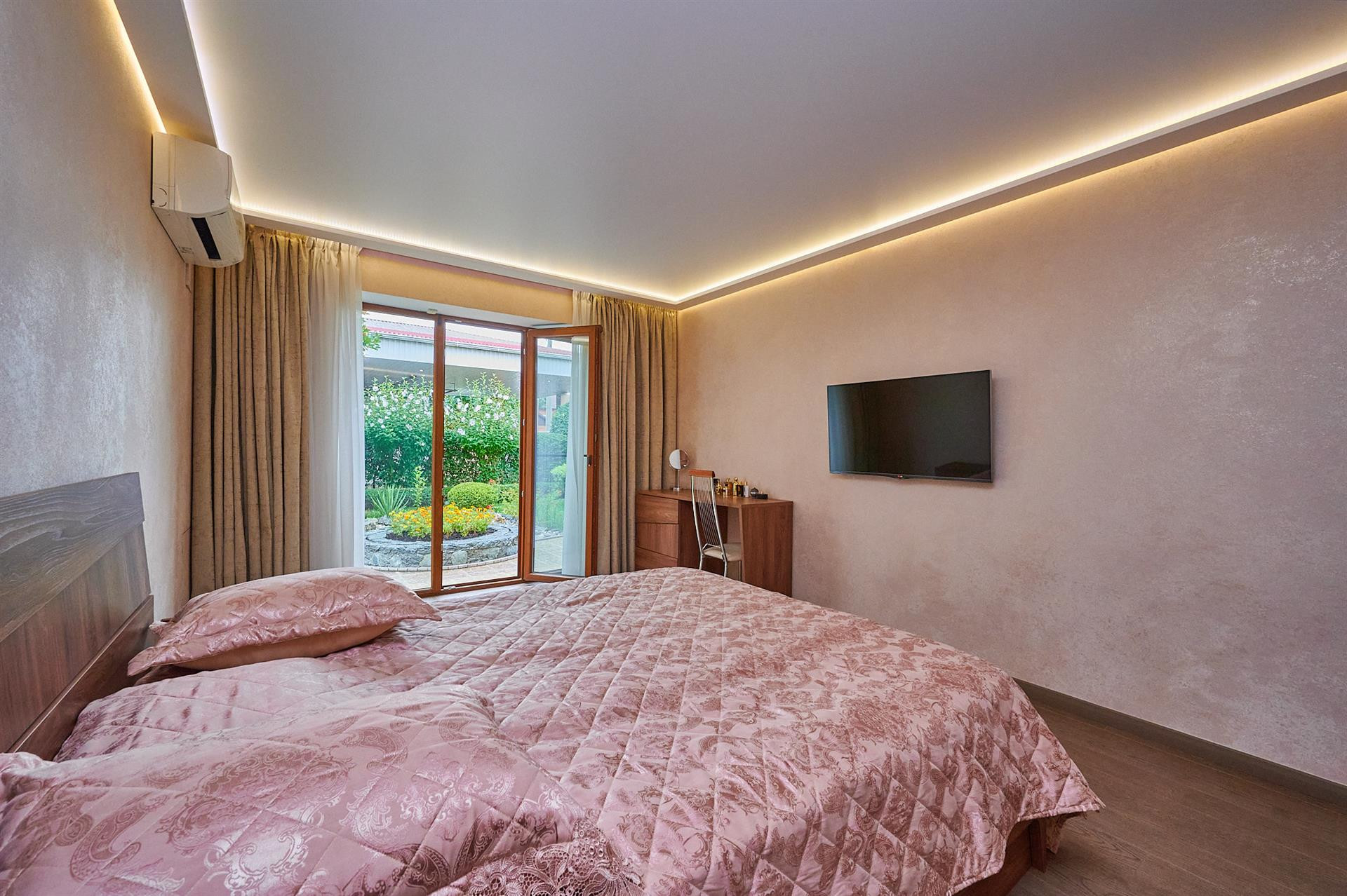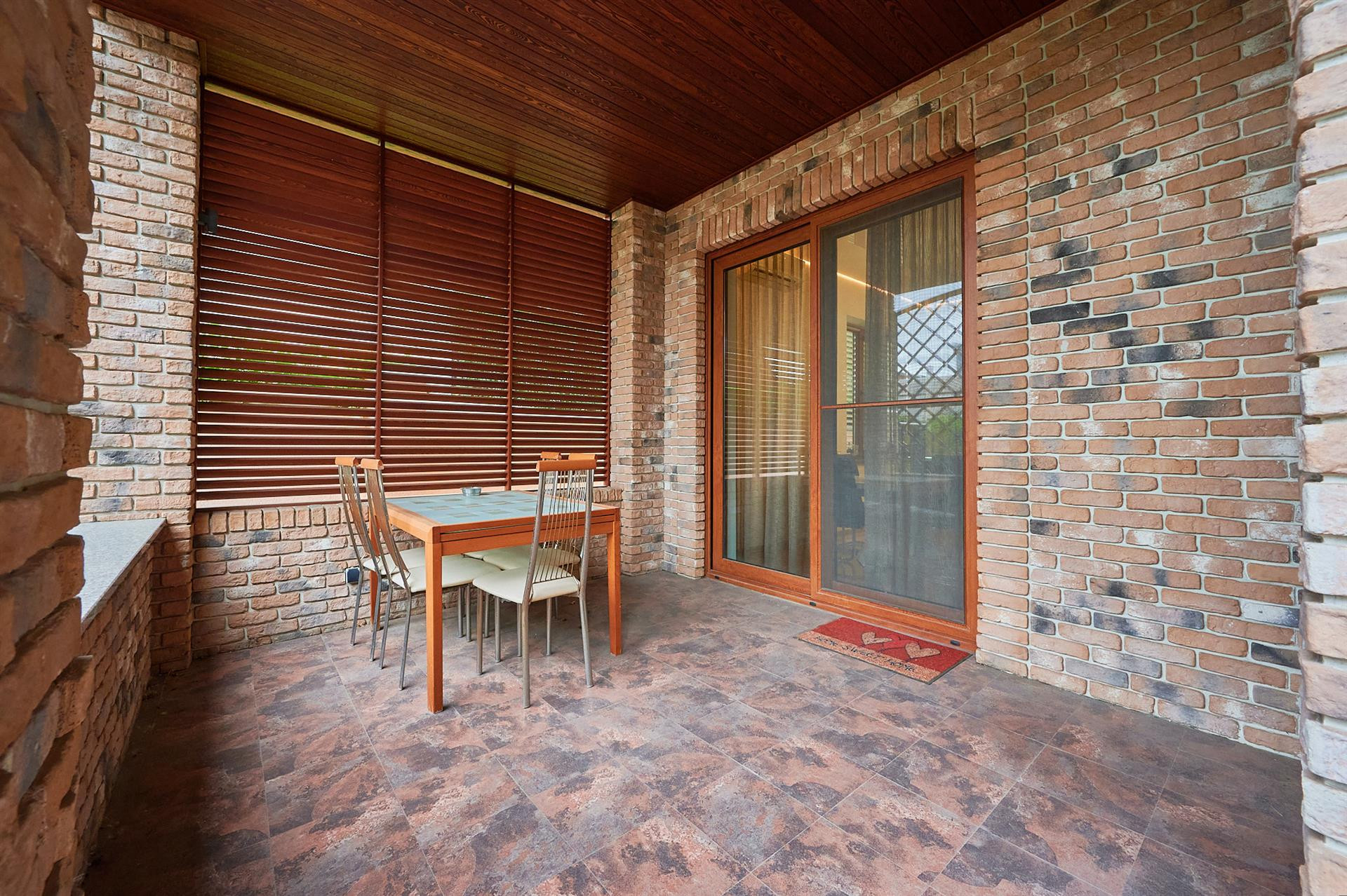 В доме 4 изолированных спальни, (в двух из которых есть выход на еще одну просторную террасу), 2 душевых, 1 ванна, просторный зал и гостиная, кухня-столовая с выходом на террасу, гардеробная и кладовая, а также отдельная комната для глажки белья, с электрической потолочной сушильной системой.