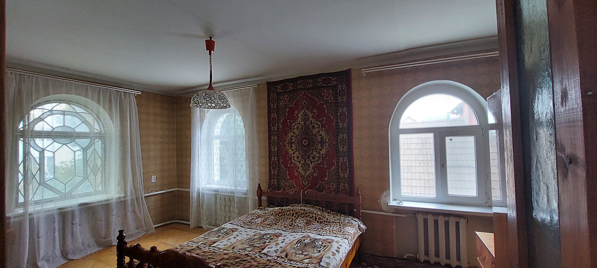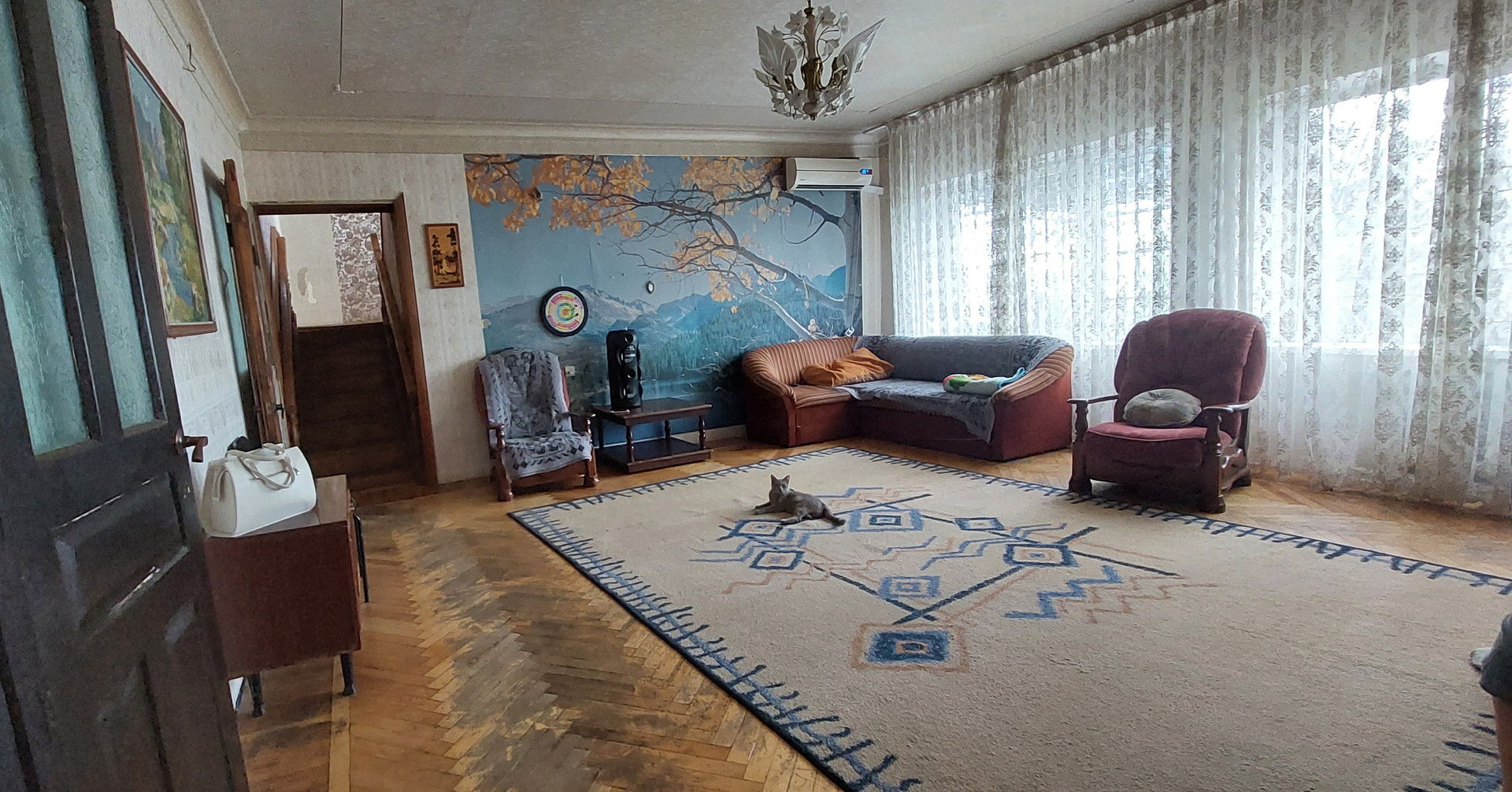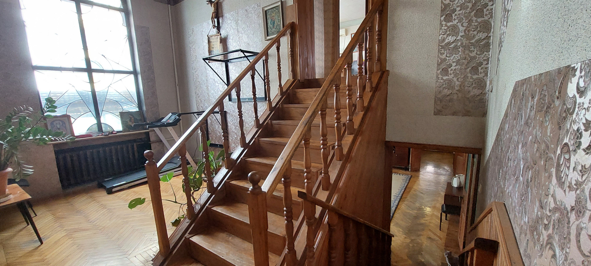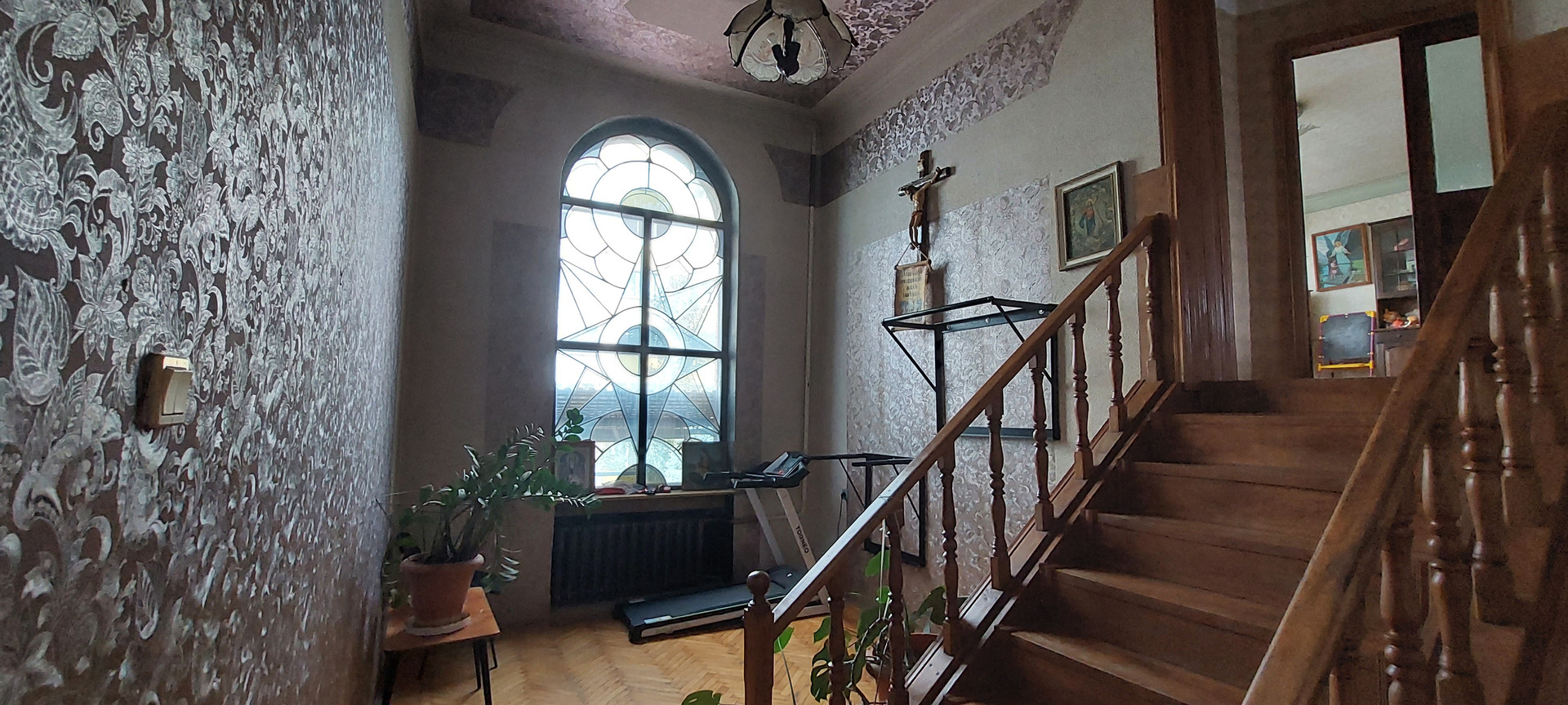 * Лестница деревянная. Между этажами холл, высотой 4м с тренажерами. На окне мозаика. Высота в  комнатах 3 метра.