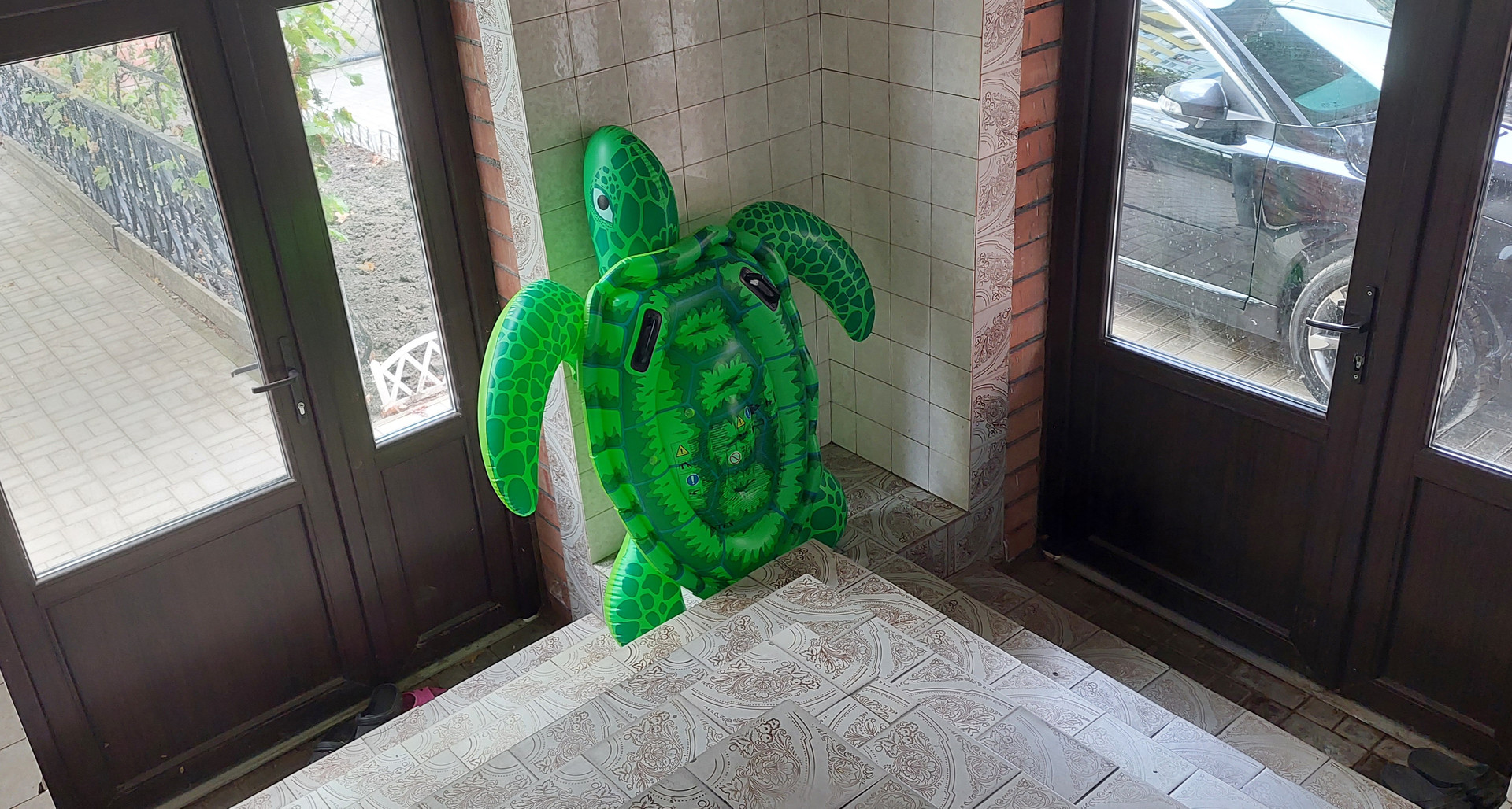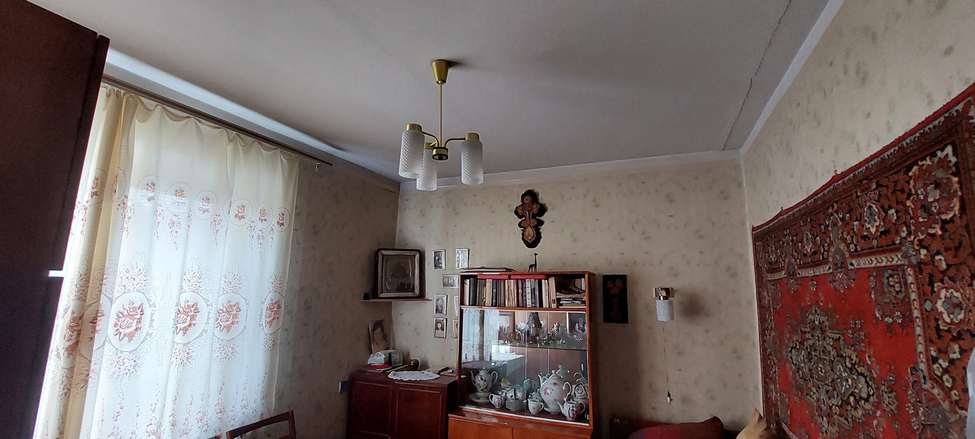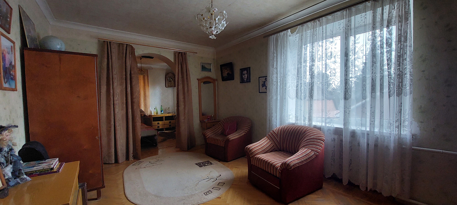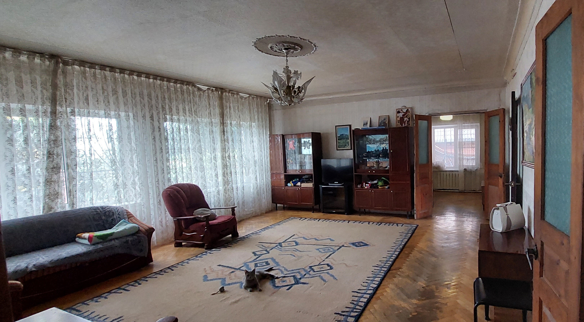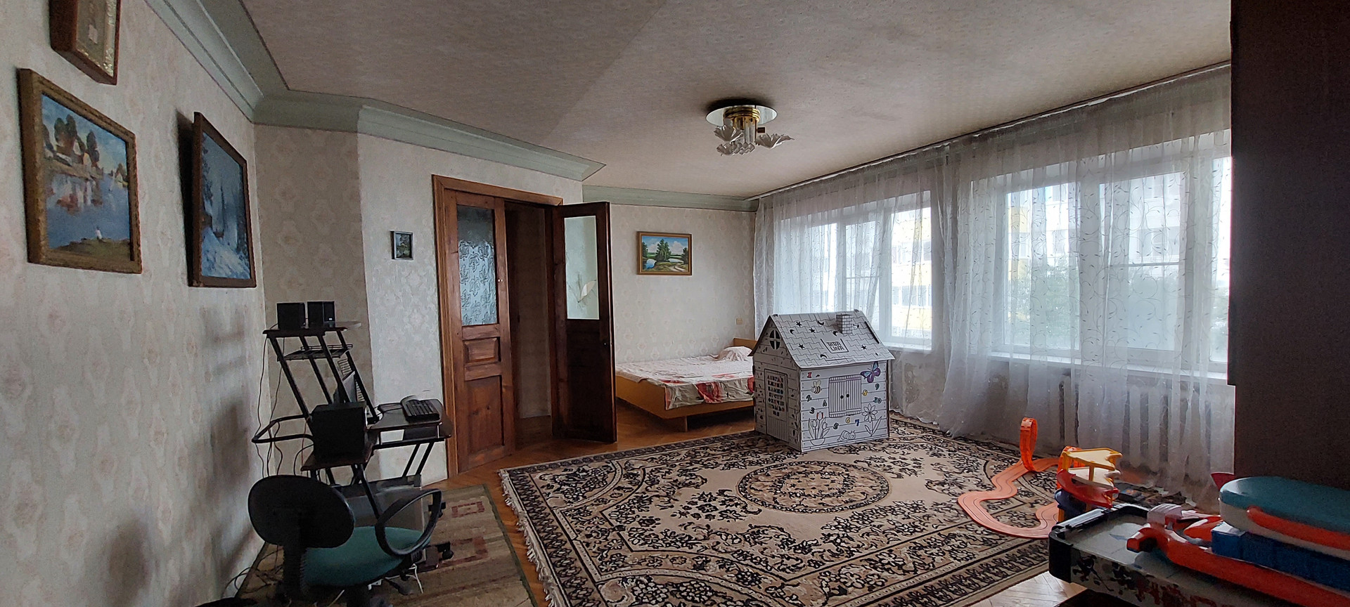 * Лестница деревянная. Между этажами холл, высотой 4м с тренажерами. На окне мозаика. Высота в  комнатах 3 метра.