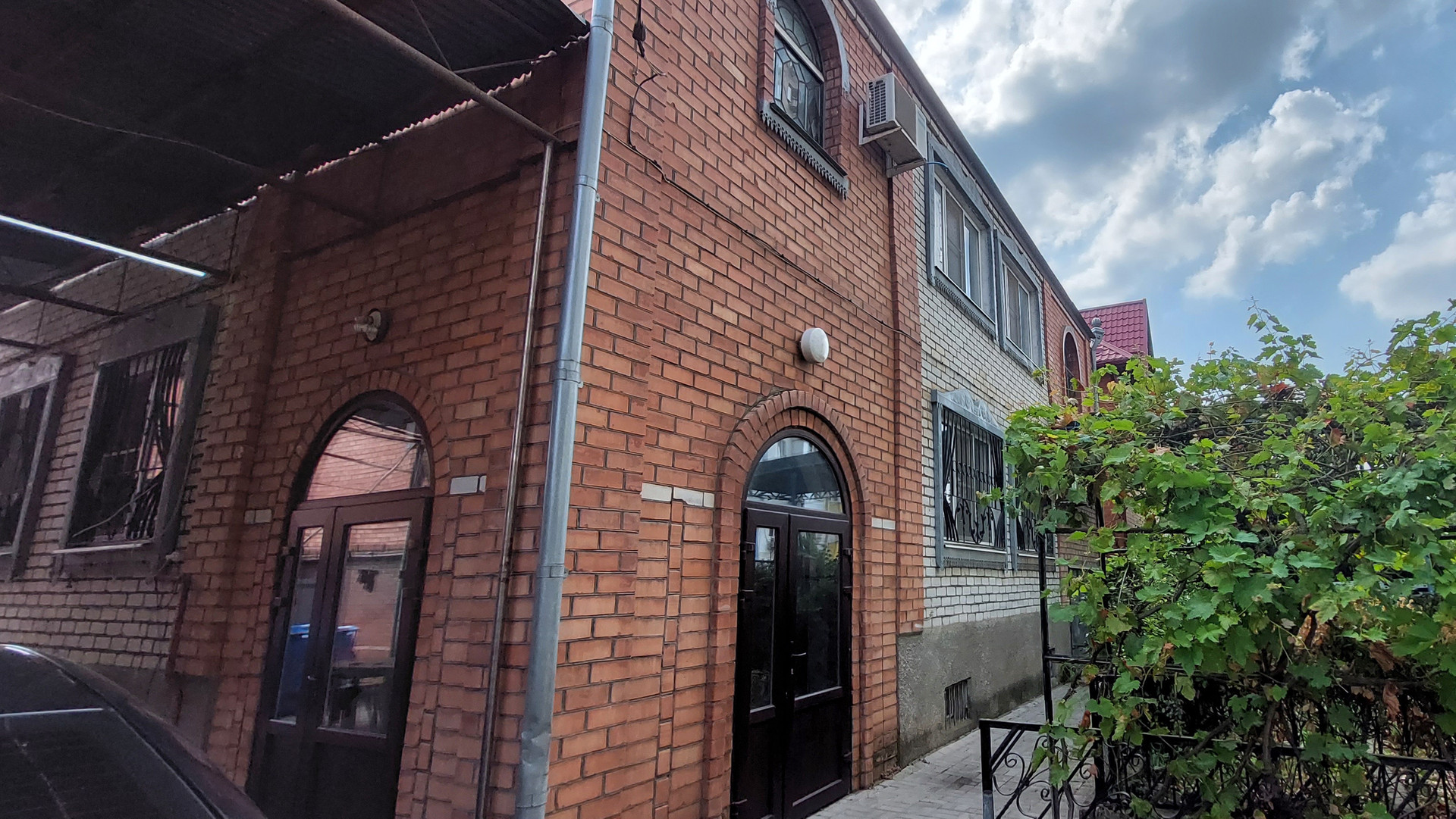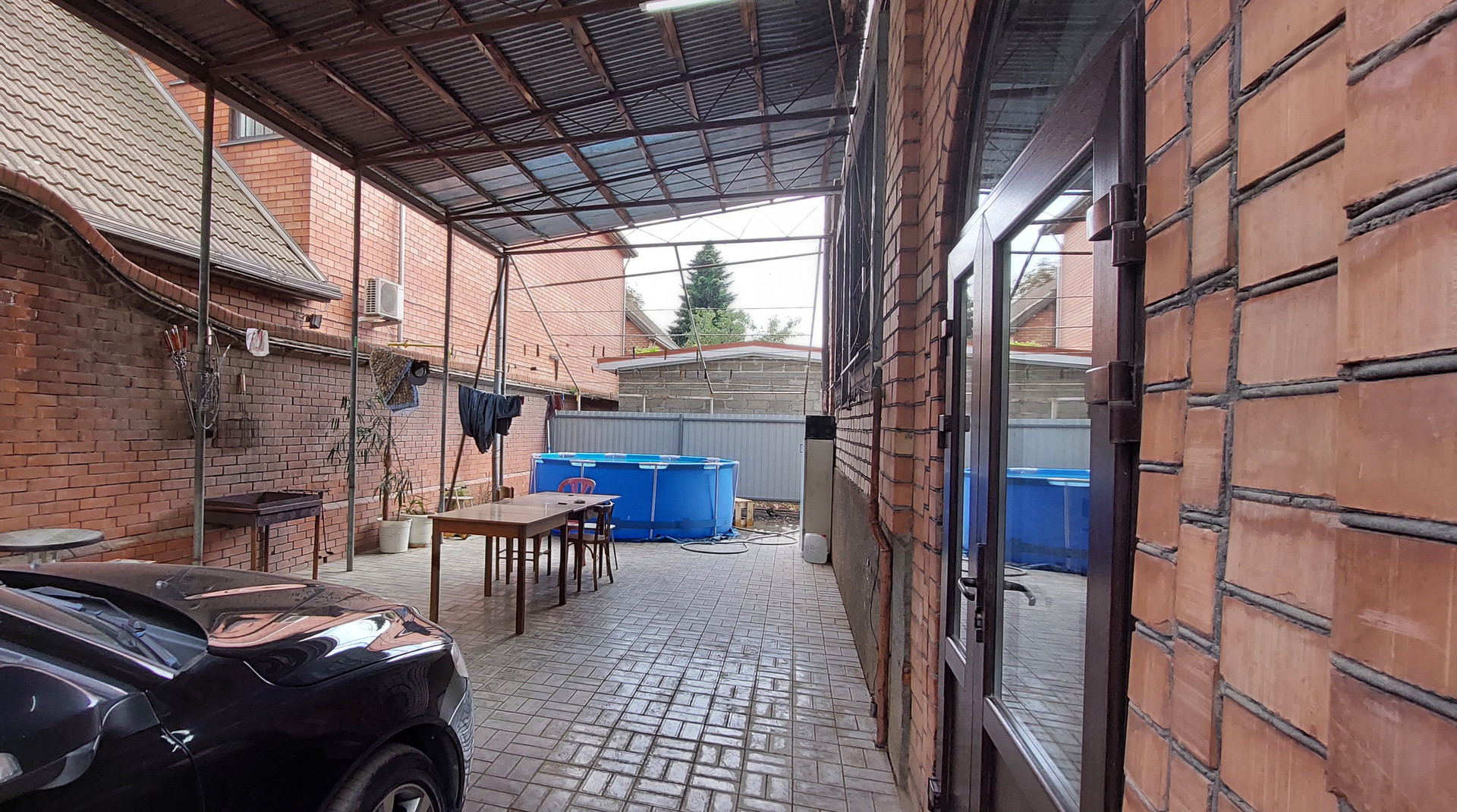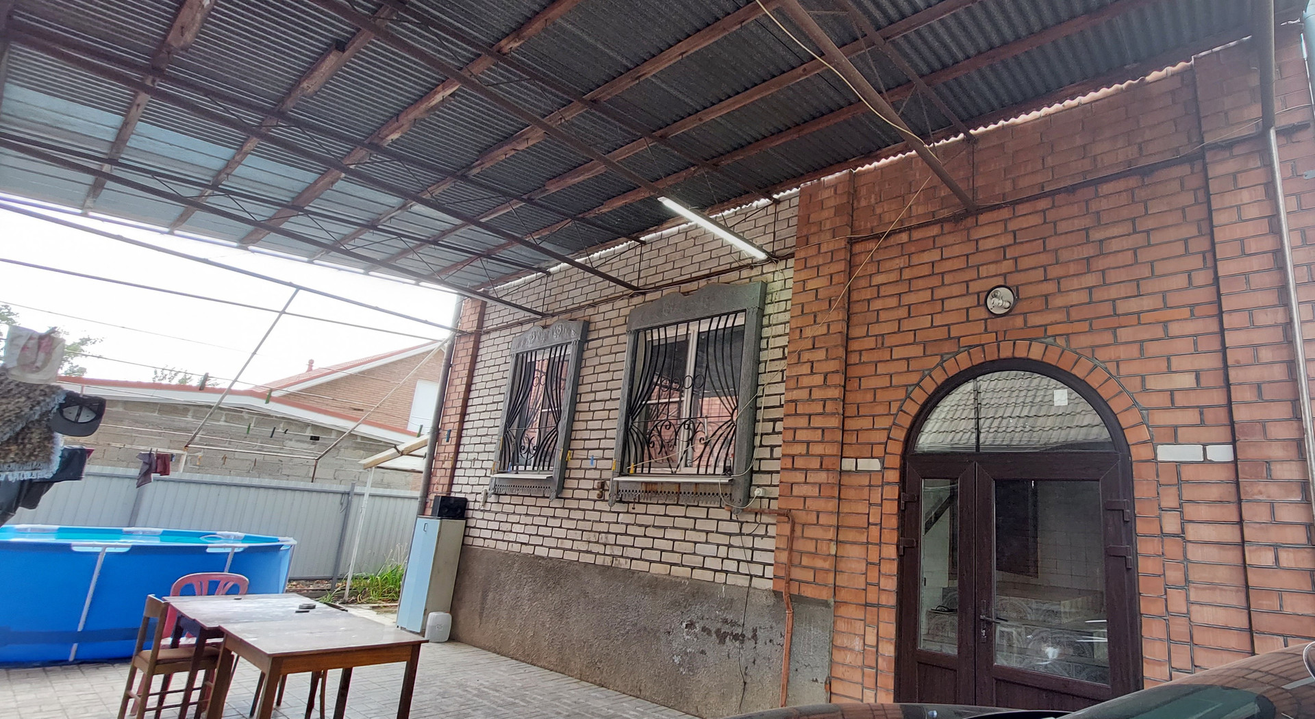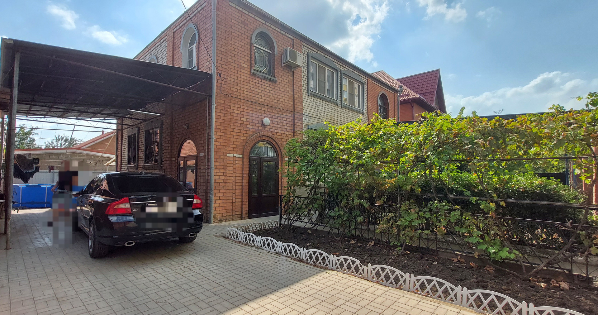 * Гараж.  Во двор есть два заезда с распашными воротами и калитка. Двор выложен плиткой. Уютный, ухоженный. Два больших навеса. Арка с виноградом, место для бассейна..