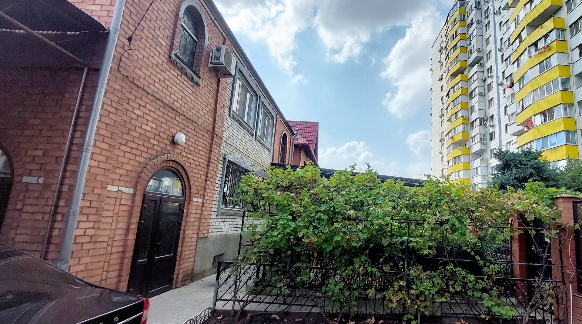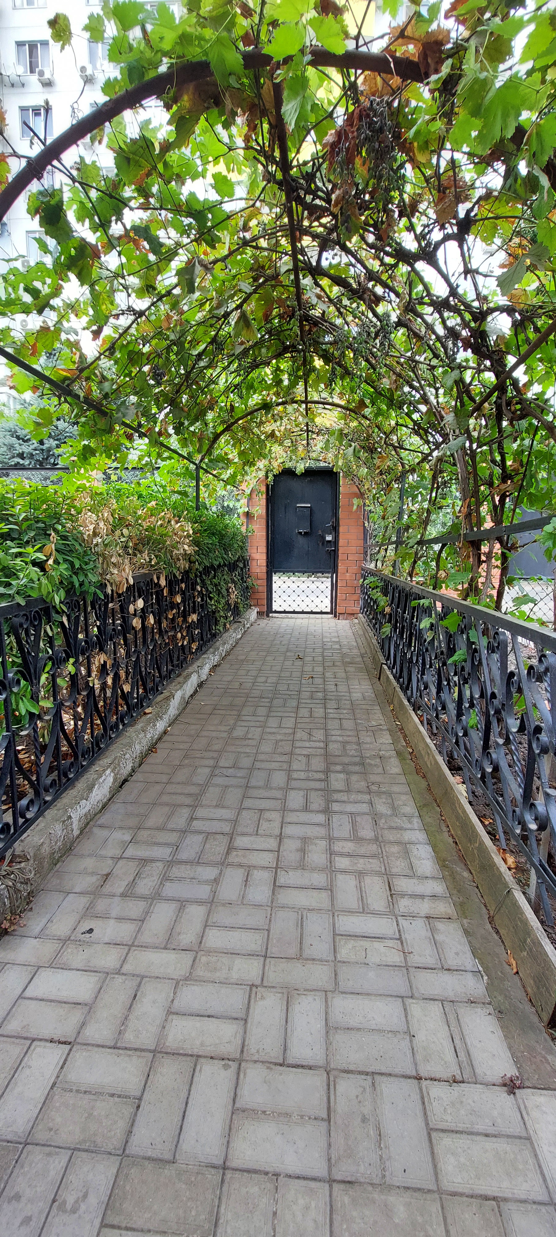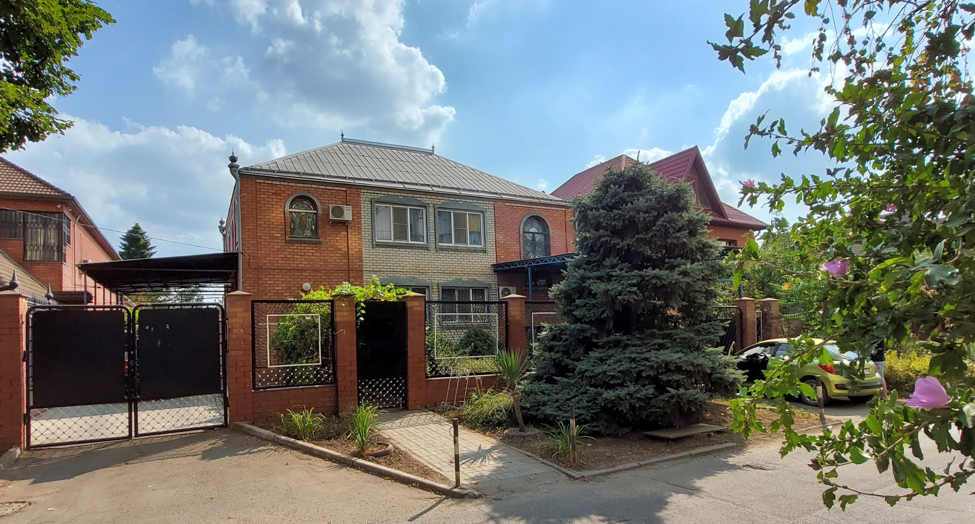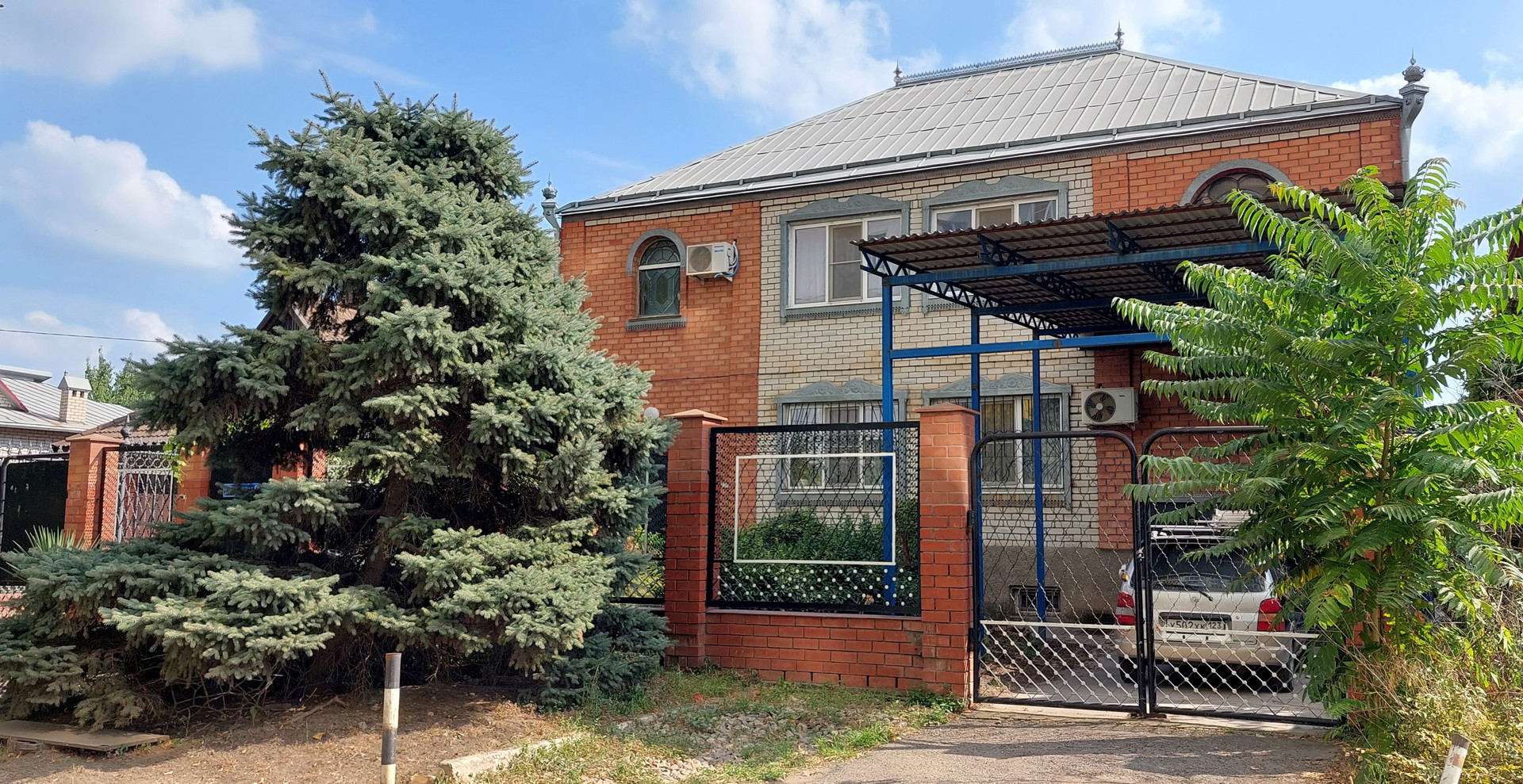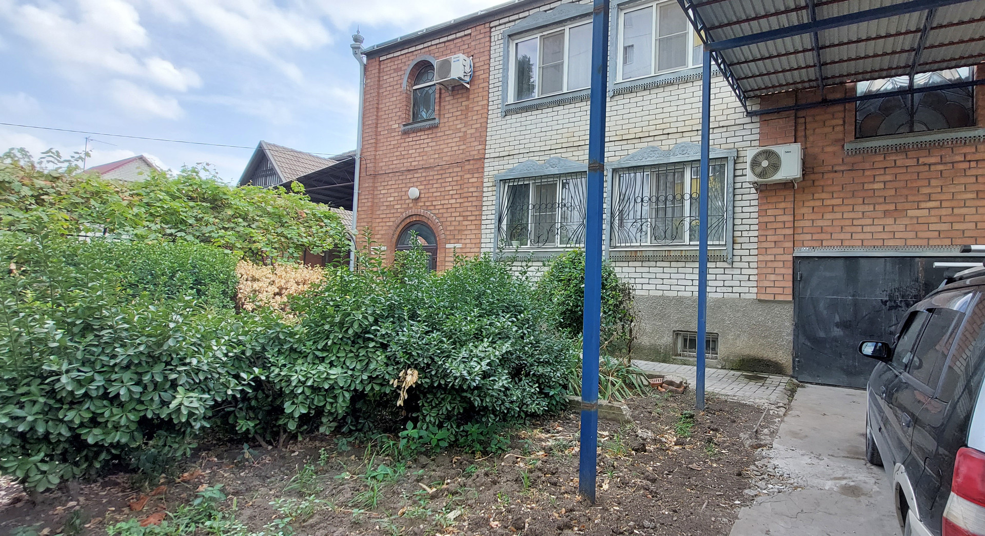 * Гараж.  Во двор есть два заезда с распашными воротами и калитка. Двор выложен плиткой. Уютный, ухоженный. Два больших навеса. Арка с виноградом, место для бассейна..