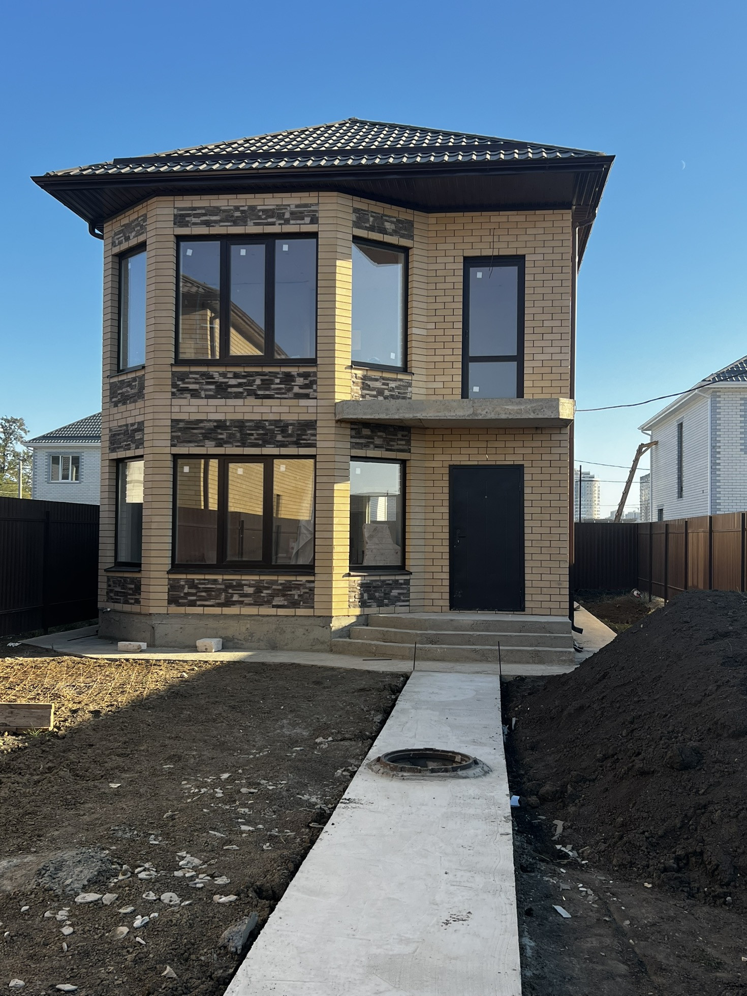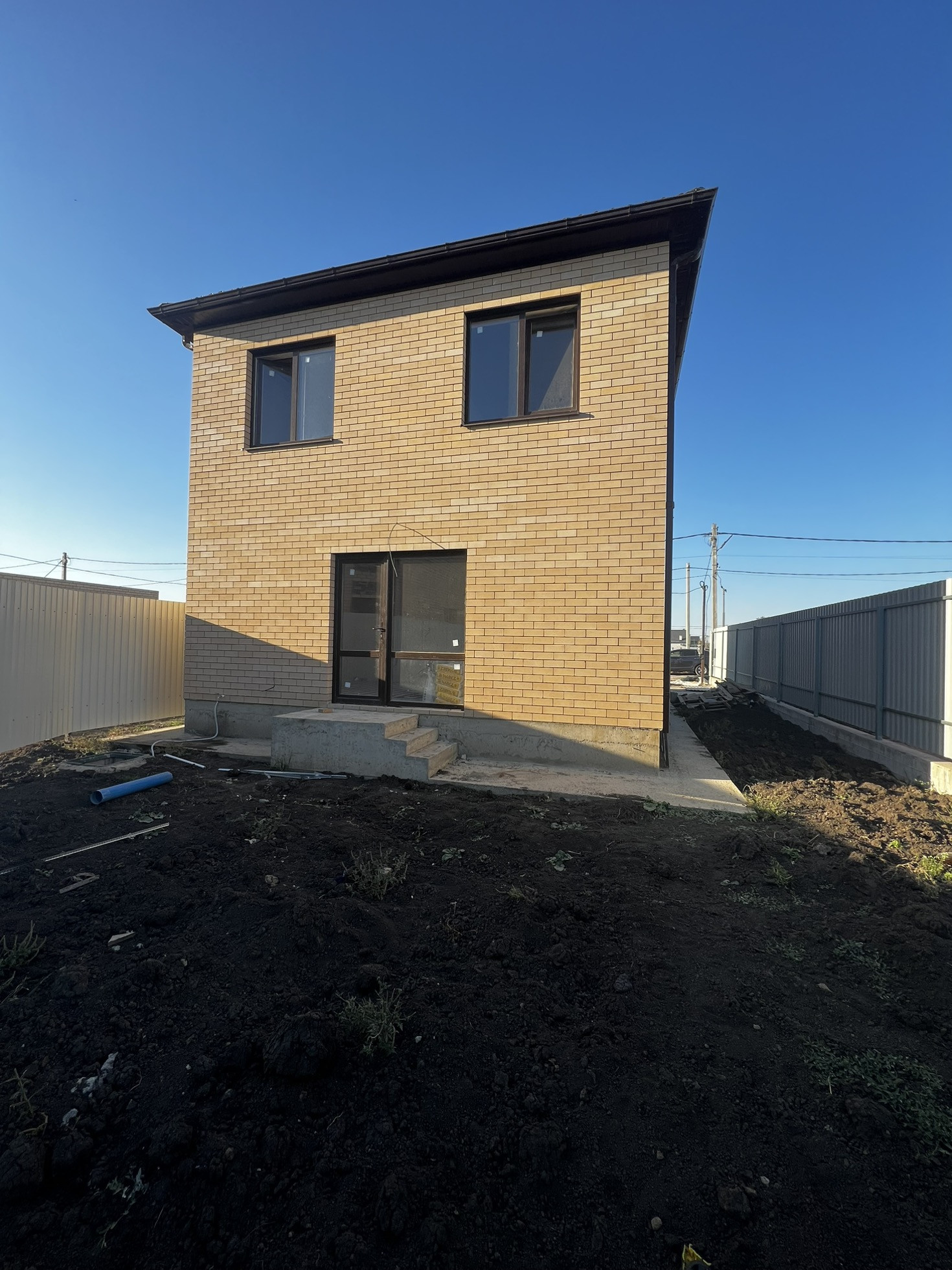 Во дворе залита отмостка вокруг дома, дорожки и парковочное место.