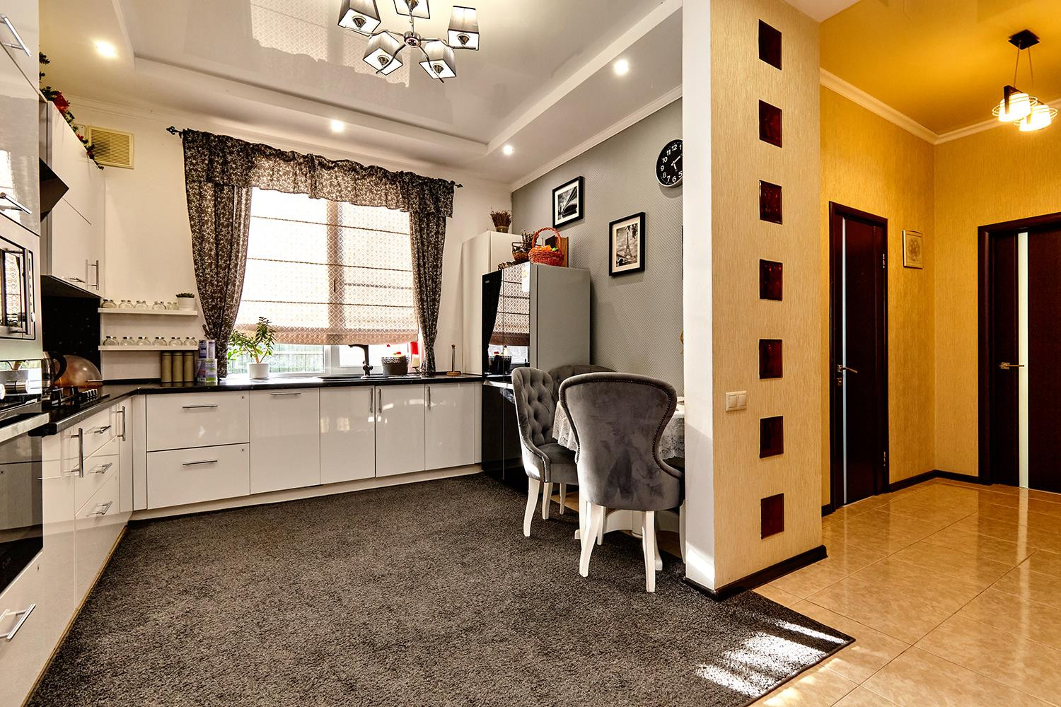 На первом этаже просторная прихожая, гостиная с панорамным остеклением, кухня-столовая, комната для гостей и санузел. Поднимаясь на второй этаж, по великолепной лестнице из массива, Вы можете попасть в четыре спальни в одной из которых есть гардеробная и балкон, а также на этаже находится просторный санузел. Ремонт в доме сделан из качественных материалов, остаётся часть мебели и техники. Большие окна во всех комнатах и естественное освещение, позволяют экономить на электроэнергии.