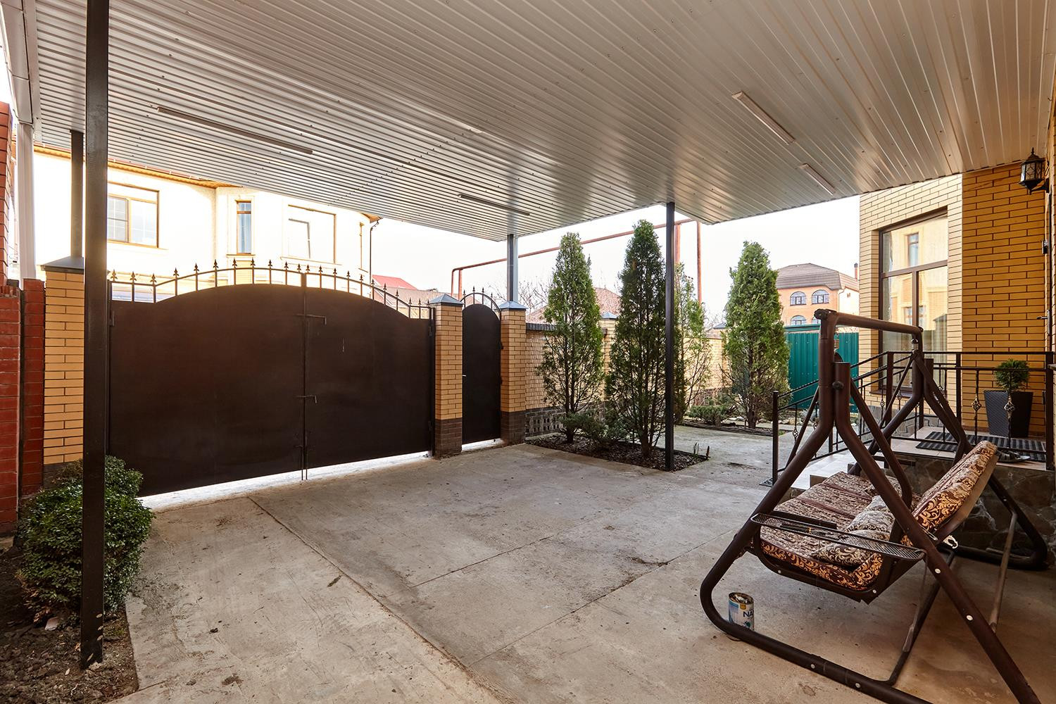 Просторный двор забетонирован. Ухоженные клумбы, туи, зеленые насаждения и придомовая территория.
