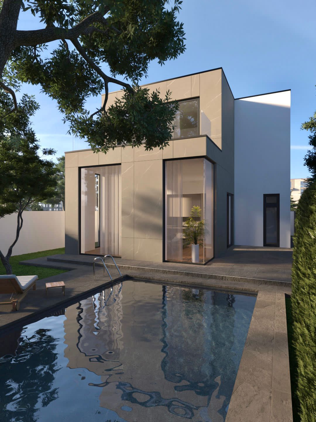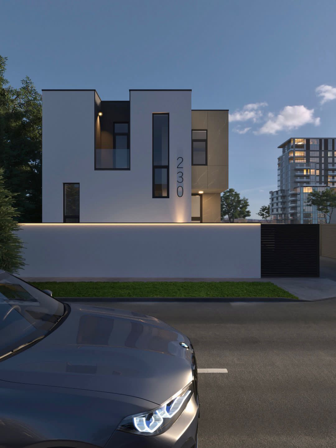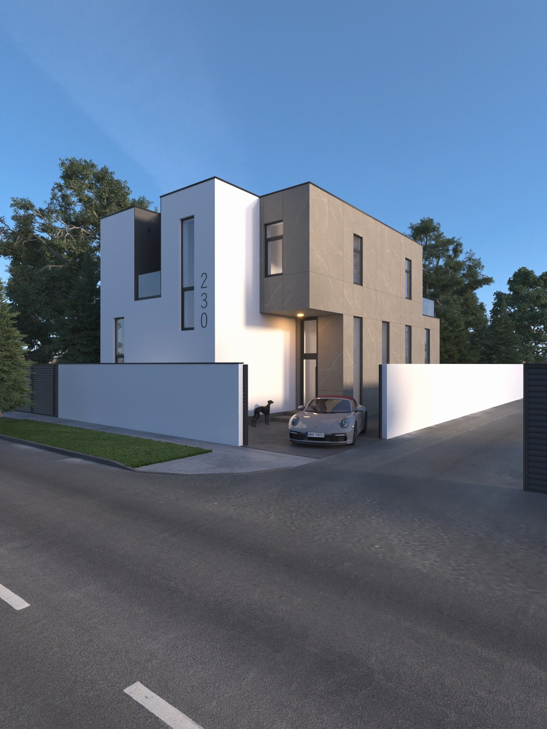 Четыре спальни, два санузла . Терраса на втором этаже 16 м2, веранда 18м2. Алюминиевое остекление. Раздвижные системы - ALUMIL. Потолки первого этажа 4 метра. Озеленение с автополивом. Газ, электричество, вода, Канализация. Фасад из крупноформатного керамогранита.