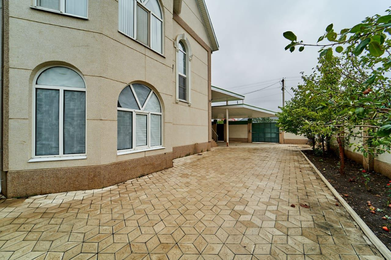 Просторный двор выложен плиткой. Ухоженные клумбы и придомовая территория, небольшой сад за домом.