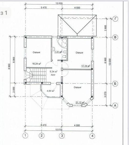 На втором этаже — холл, выход на балкон, санузел совмещен 7,31 кв.м, три спальни.