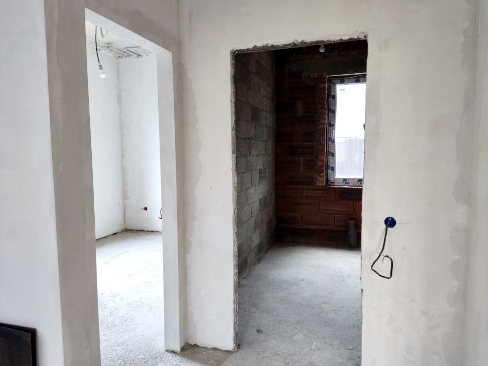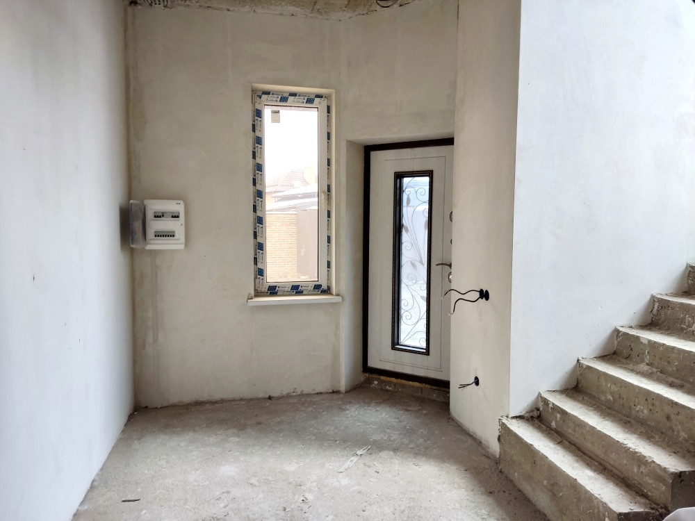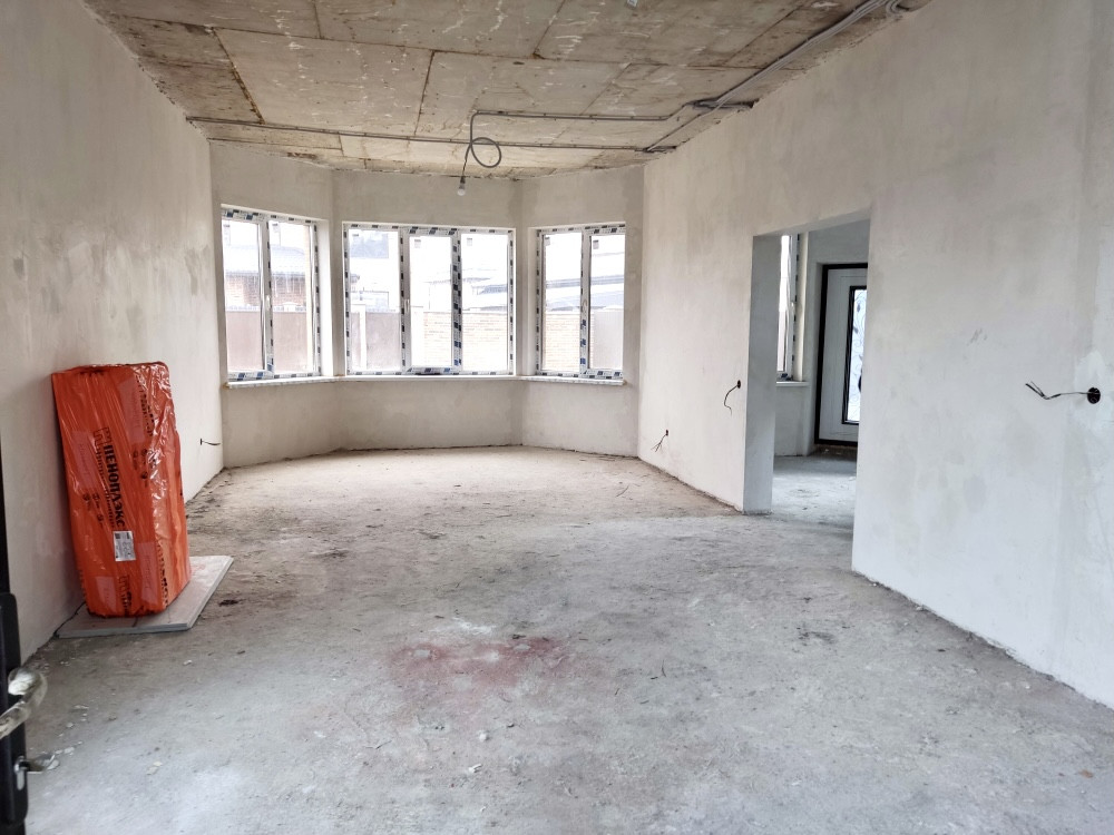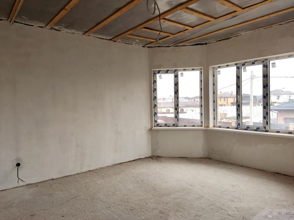 Предчистовая отделка: гипсовая штукатурка под маяк; разводка коммуникаций, тёплый пол — на первом этаже, стяжка пола, радиаторы отопления — по всему дому.