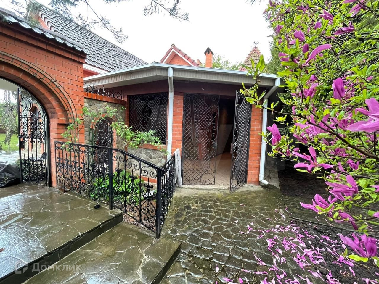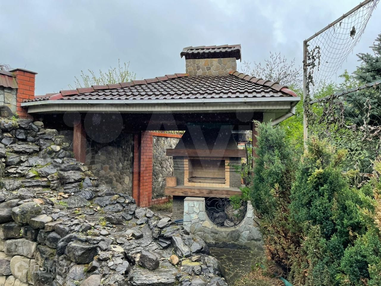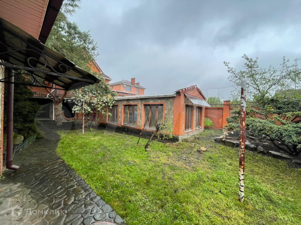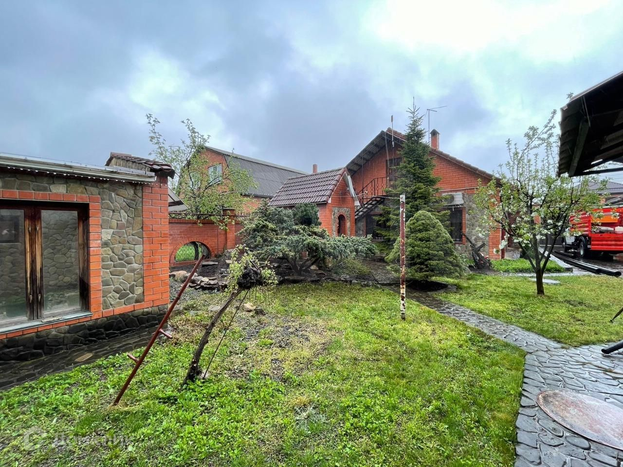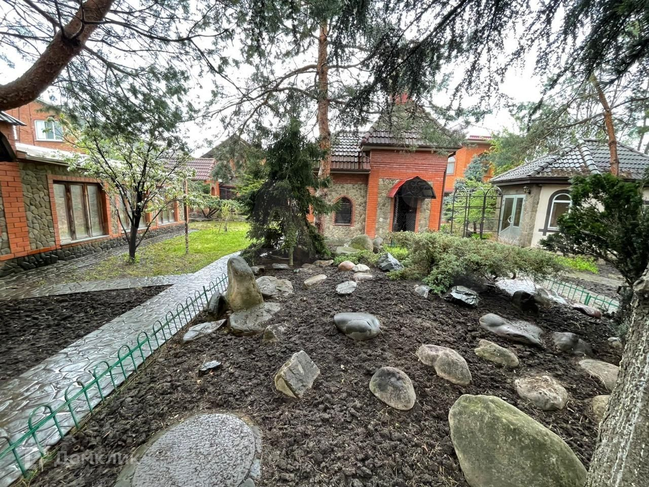 Территория благоустроена , плитка , сад , дорожки , открытый бассейн , хоз постройки .