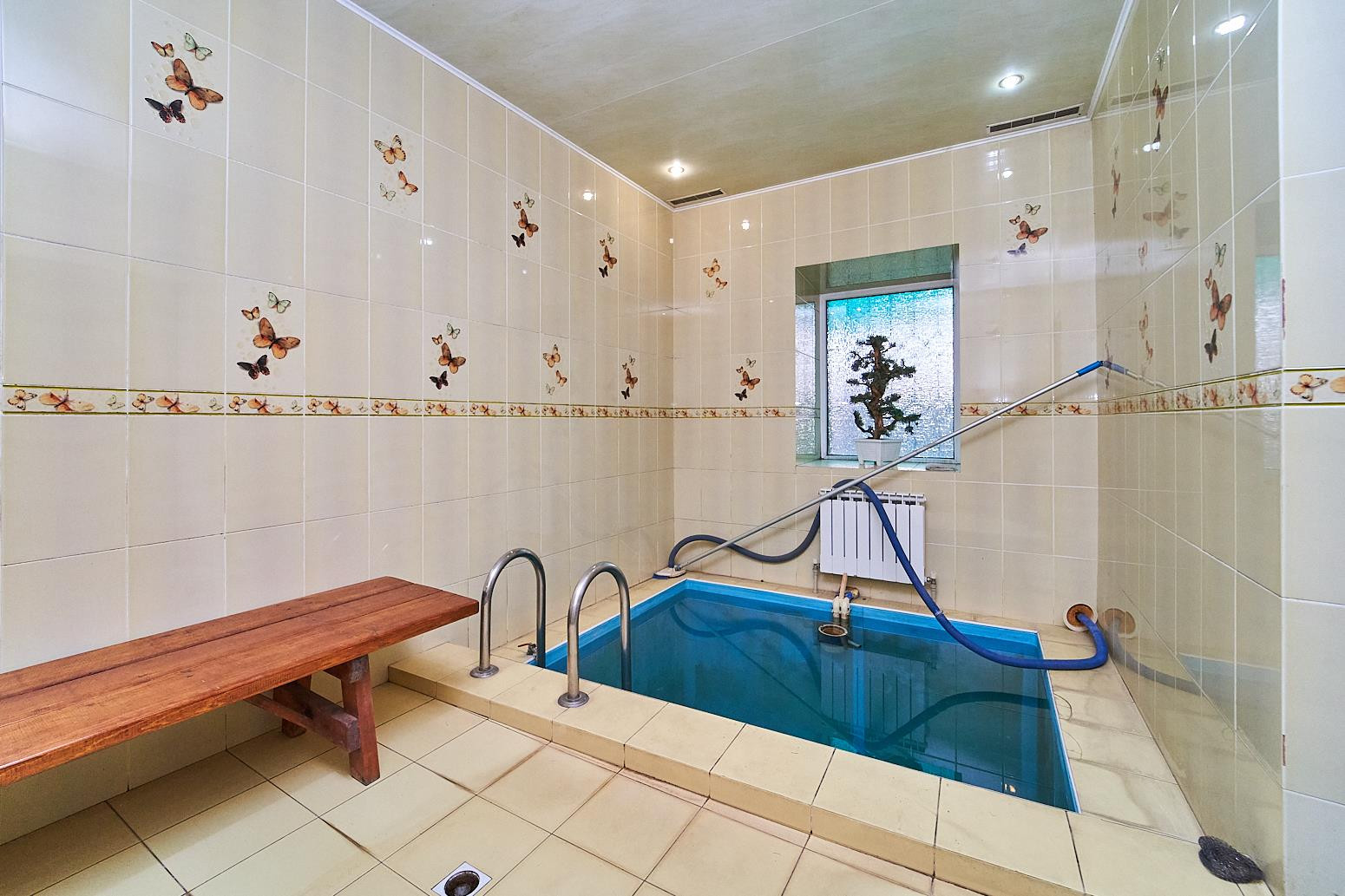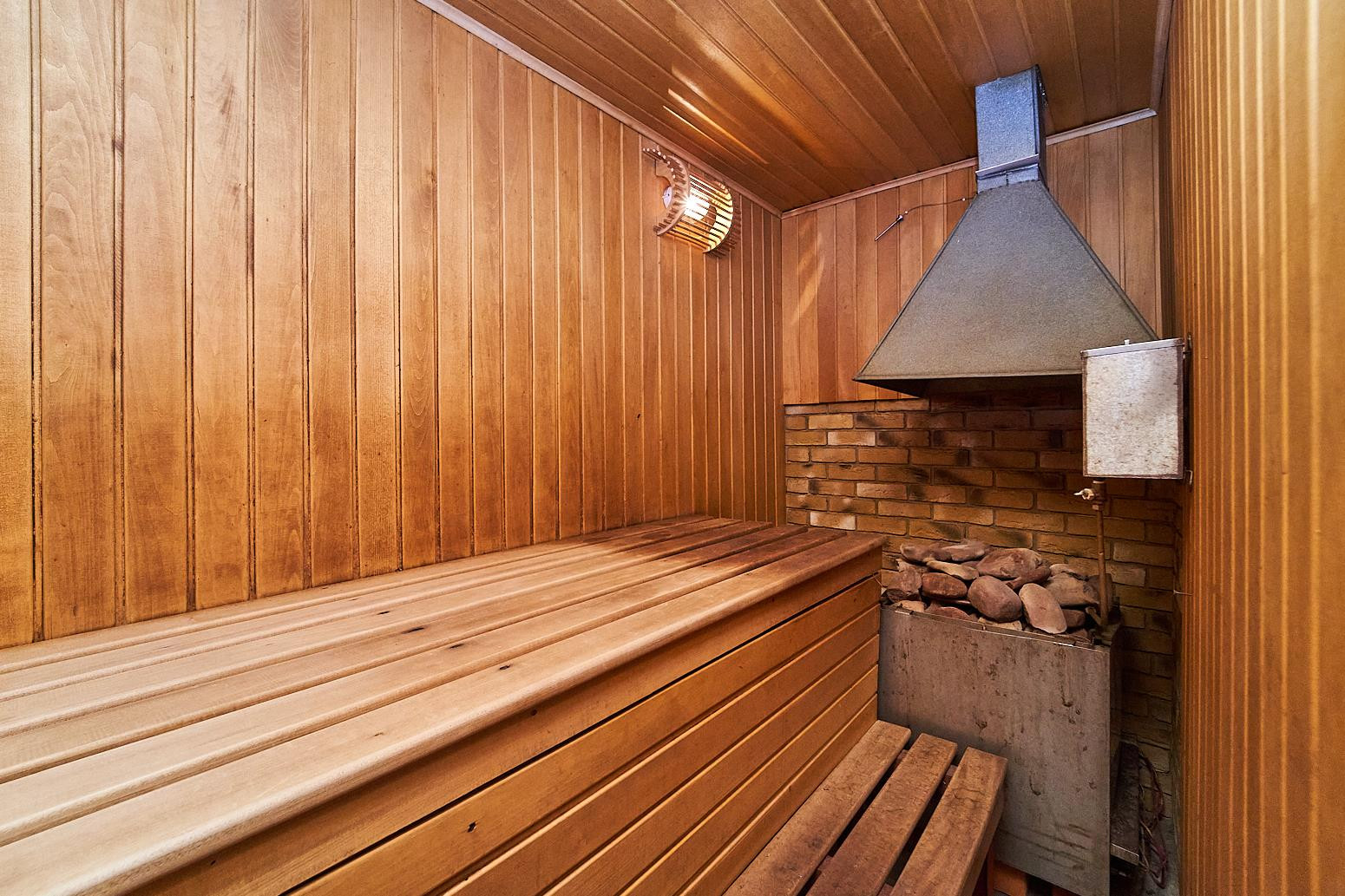 На первом этаже жилой дом 150кв.м.: 2 большие спальни, каминная комната, кухня-гостинная, 2 сан-узла, сауна, бассейн.