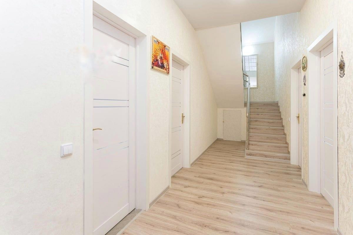 На втором этаже располагаются две спальни - 19,9 кв.м. и 20,4 кв.м., а также, сан.узел 5,1 кв.м. Высота потолков первого этажа 2,85 метра, второго - 2,7 метра. В доме сделан ремонт «под ключ» из качественных и экологичных материалов. Во всех комнатах установлены сплит-системы GREE. На кухне, сан.узле, коридоре уложены тёплые полы. Пока дом отапливается электро-котлом, однако, газовая труба находится рядом с домом, что не составит большого труда завести её в дом.
