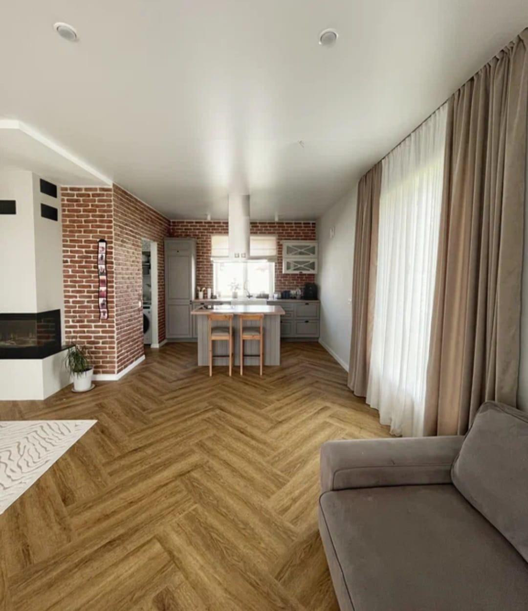В доме три спальни, большая кухня-гостиная с выходом на террасу и задний двор, две гардеробные, две ванные комнаты.