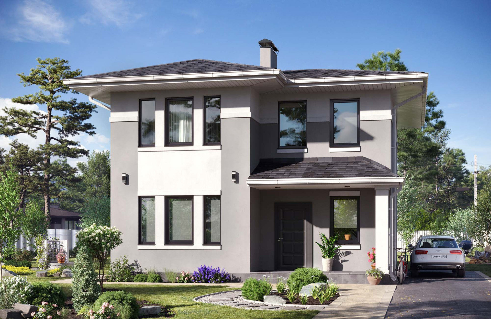 Территория вокруг дома благоустроена и озеленена. Во дворе есть зона для барбекю, а также место для парковки автомобиля.