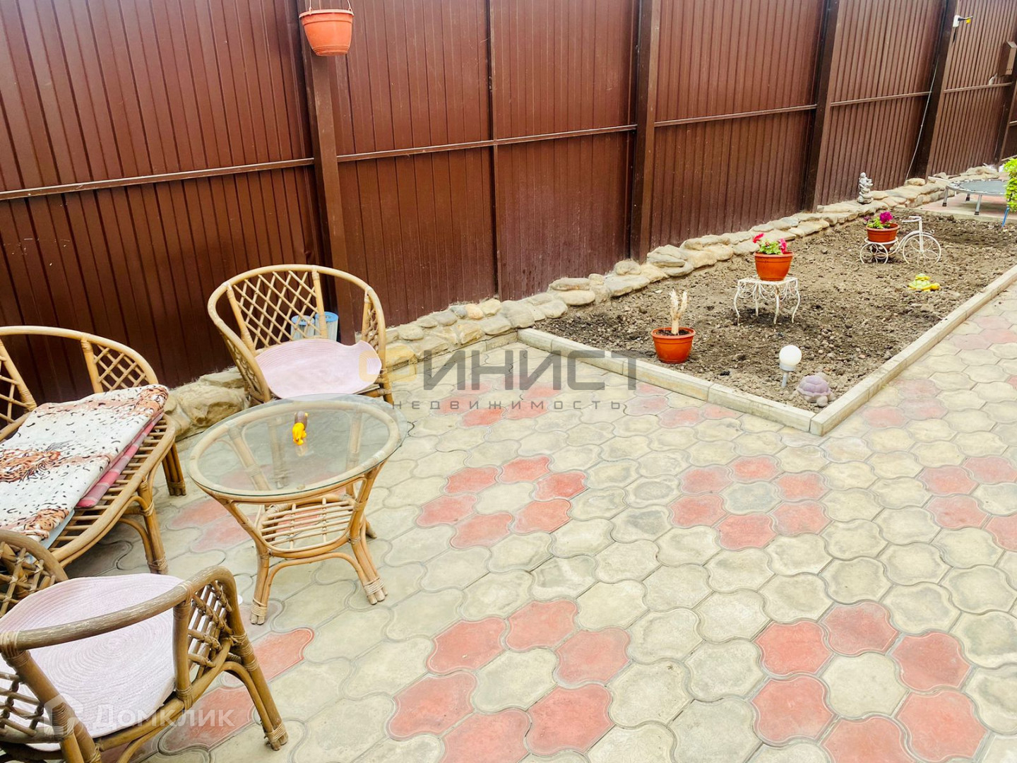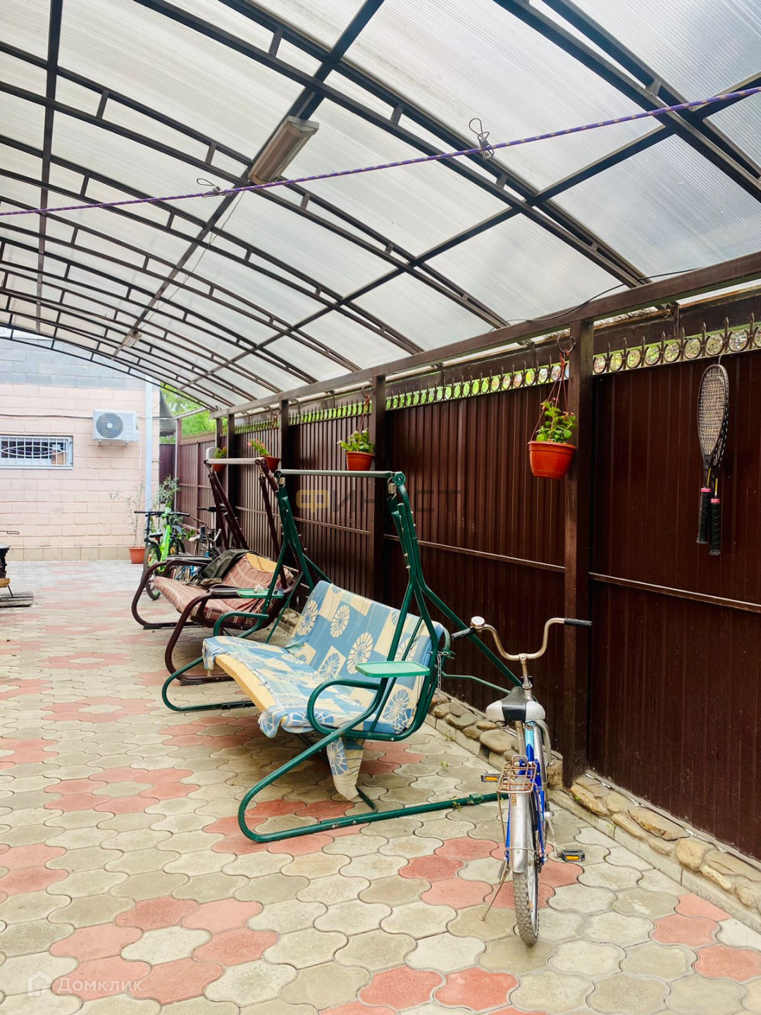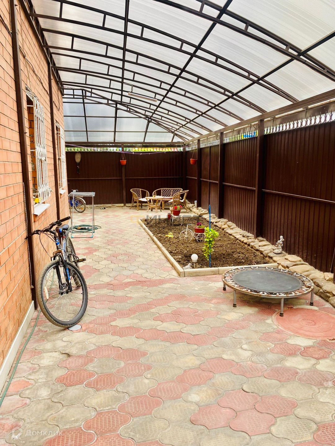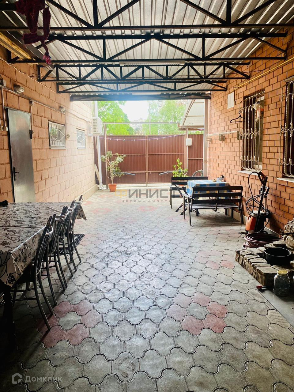 Один из основных улучшений этого дома - навес по всему периметру, создающий уютную обстановку для барбекю и отдыха на свежем воздухе. Кроме того, на участке уложена качественная плитка, что придает недвижимости стильный и аккуратный вид.
