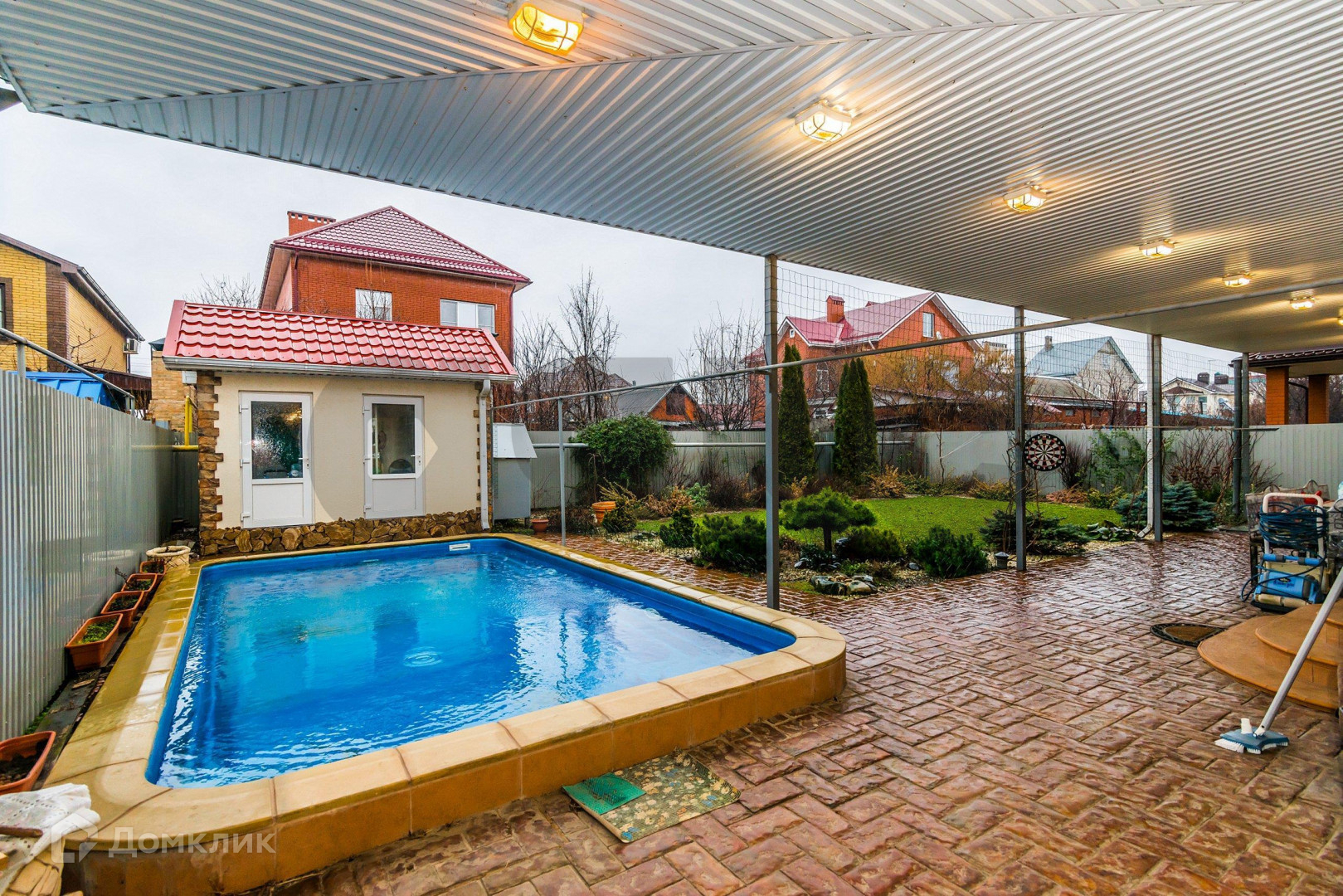 Во дворе дорогостоящий бассейн, прекрасный фруктовый сад.