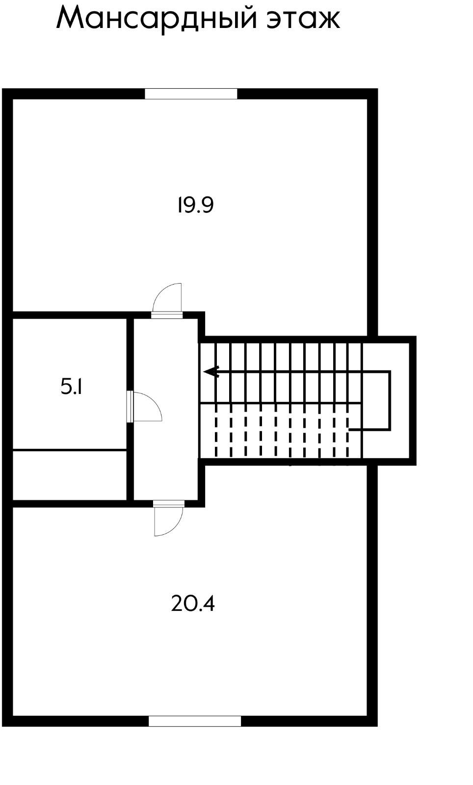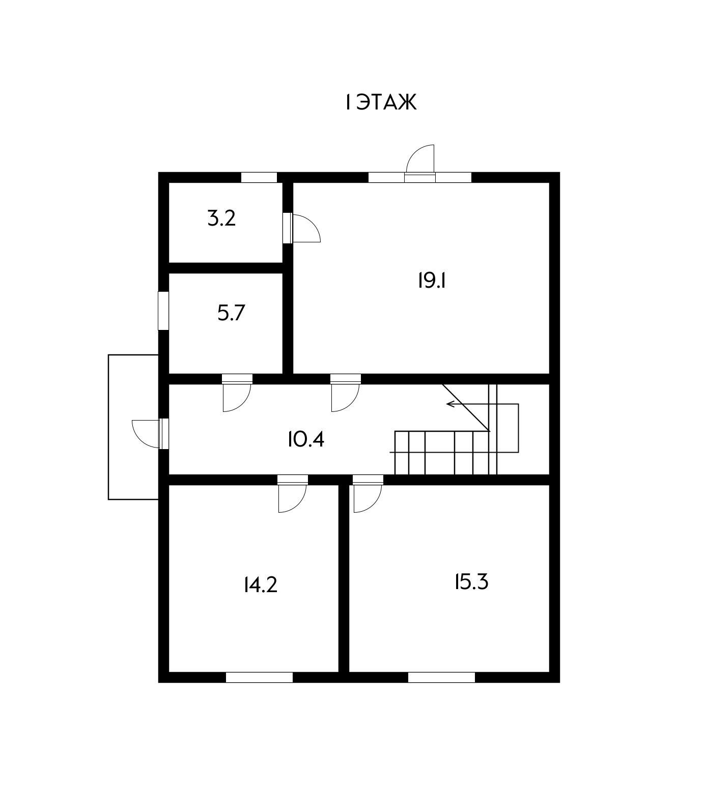 Дом 2-х этажный с мансардой. На первом этаже две комнаты - 14,2 кв.м. и 15,3 кв.м., большая кухня-гостиная 19,1 кв.м. с выходом на террасу, совмещённый сан.узел 5,7 кв.м., кладовая 3,2 кв.м., коридор 10,4 кв.м.