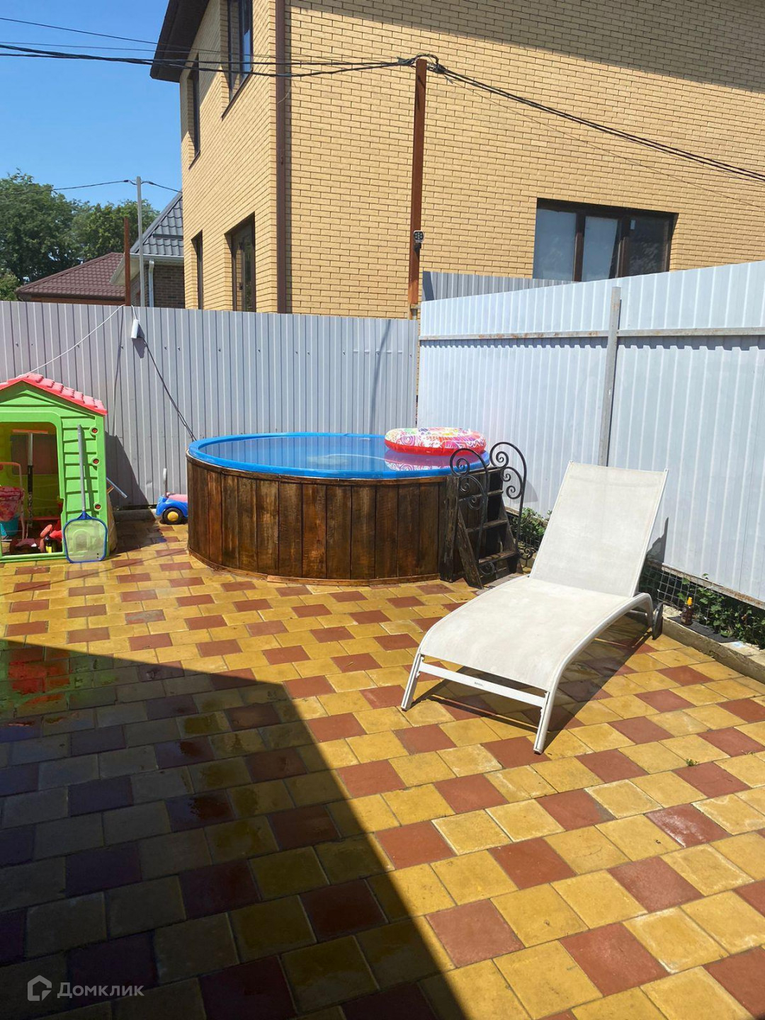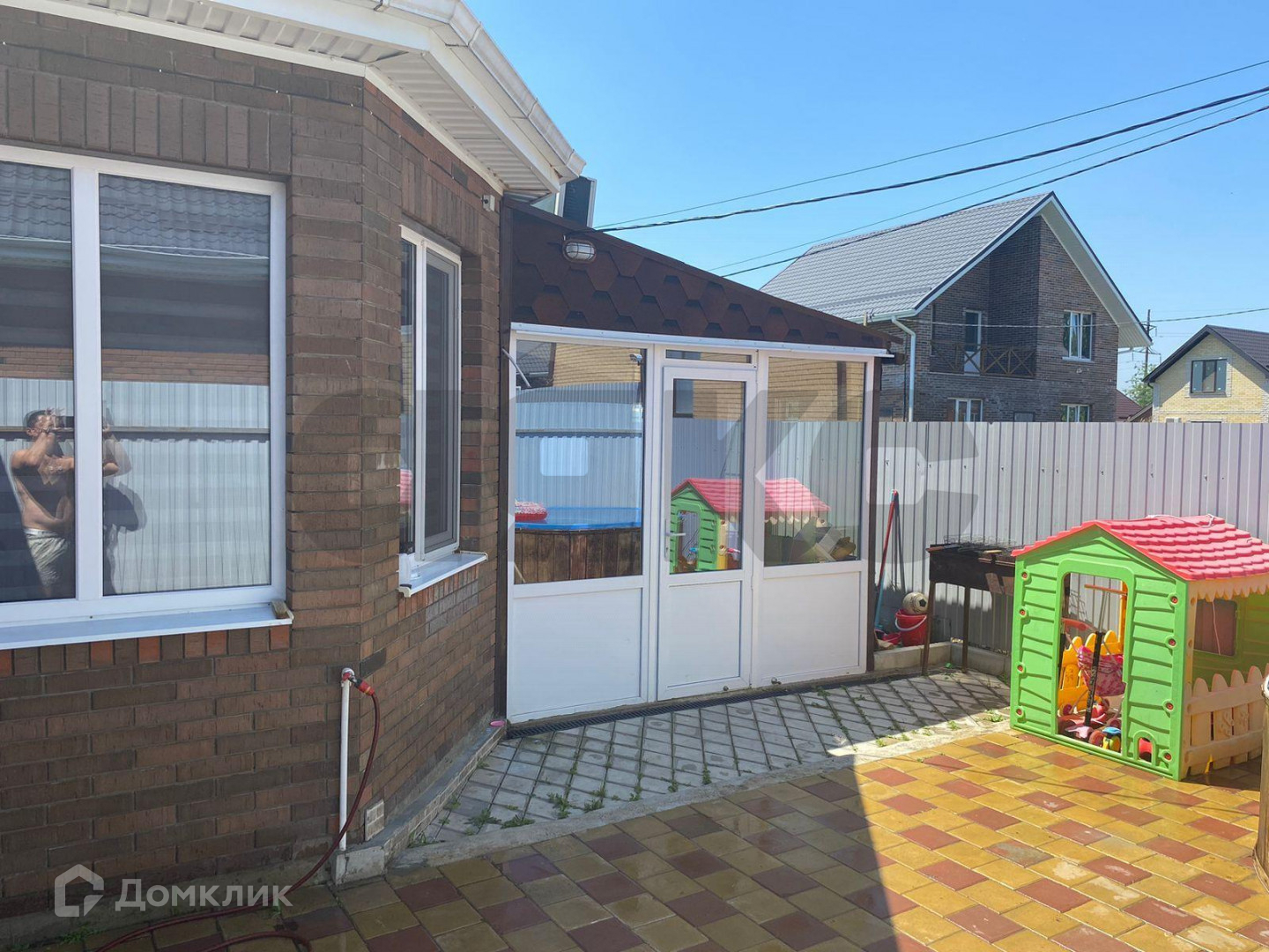 Дом теплый, стены выполнены из кирпича, энергоемкий, летом в нём прохладно, а зимой очень тепло. Участок облагорожен, озеленен, высажен газон и плодовые деревья, большая часть участка выложена плиткой, сделан навес под авто, установили бассейн, ссади дома расположена баня и летняя беседка с кухней.