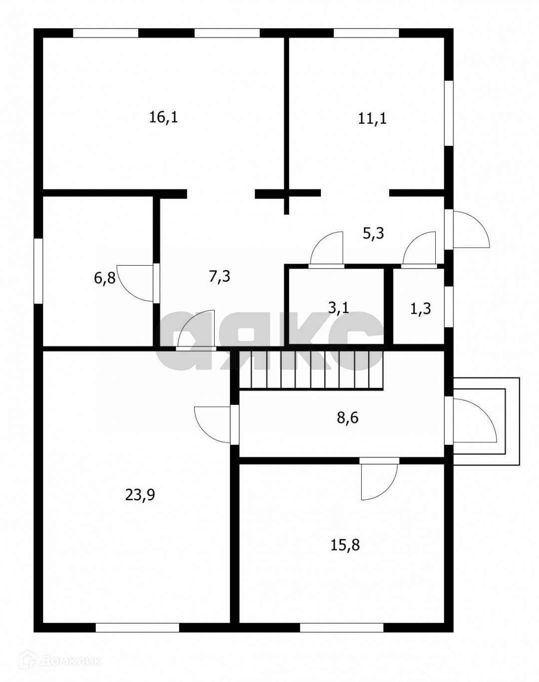 На первом этаже кухня 11 кв.м, гостиная 24 кв, две комнаты по 16 кв.м., малая комната или кабинет 7 кв.м.