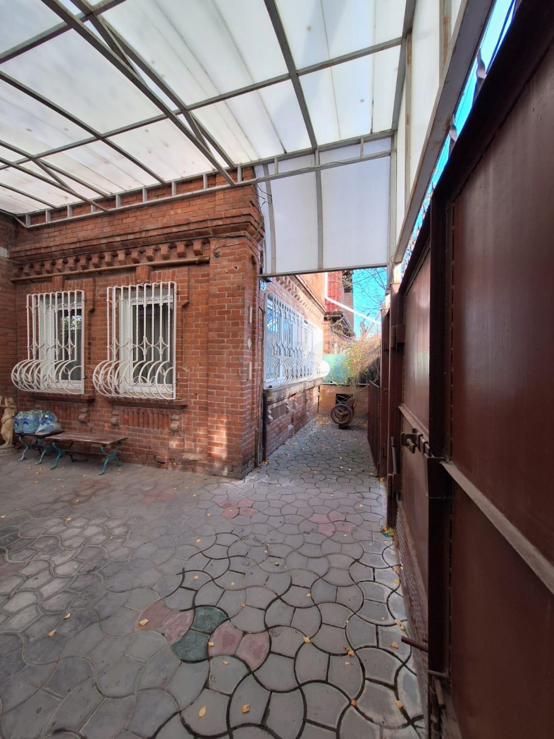 Во двор,выложенный плиткой, могут заехать 2 машины.
