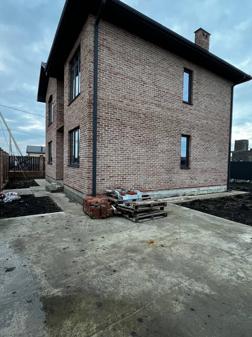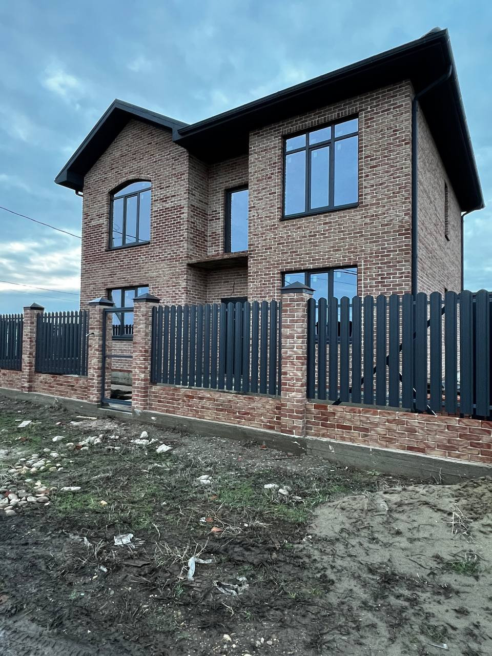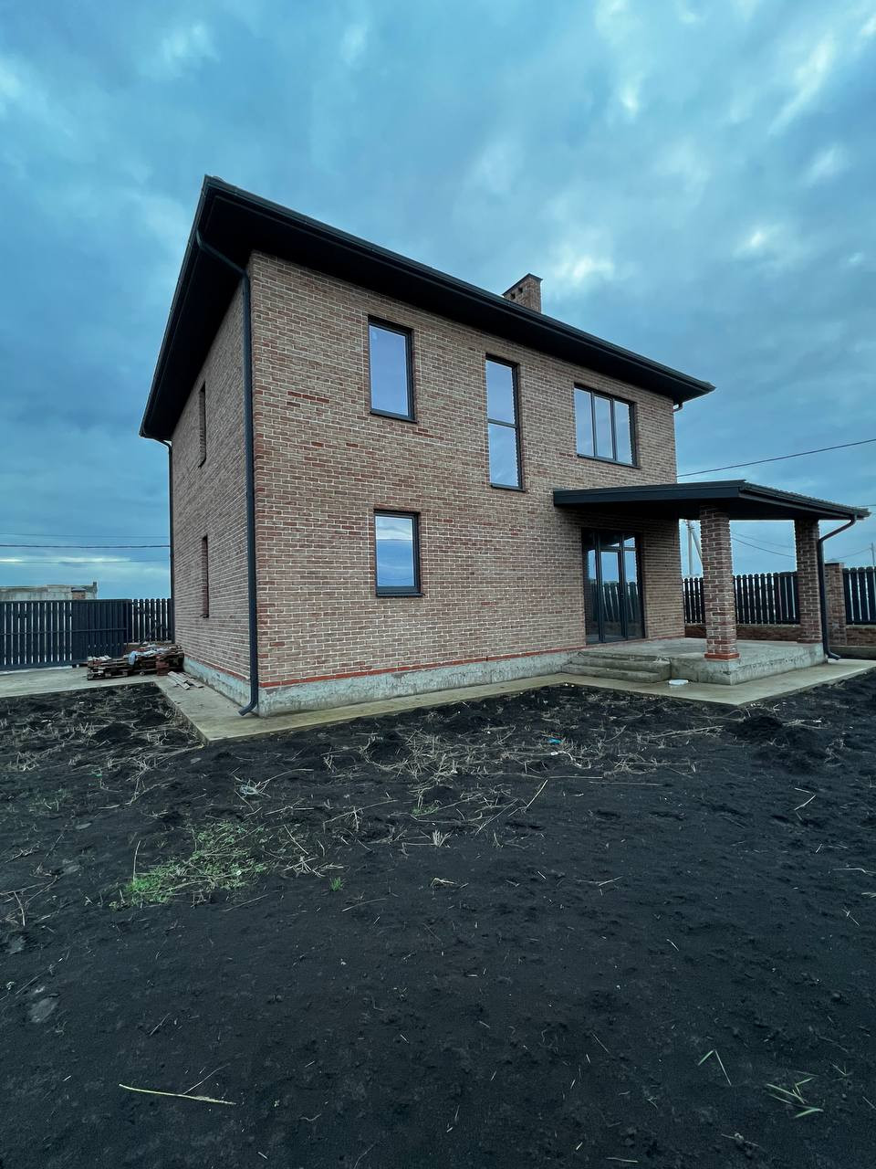 Во дворе забетонированная площадка под авто, забор по периметру из металлопрофиля, откатные ворота, по фасаду кирпичные столбы, широкая придомовая территория.