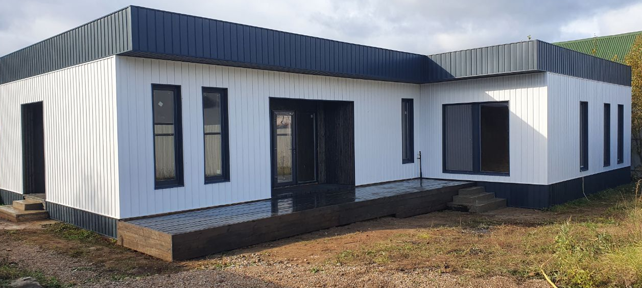 Площадь дома составляет 150 кв. метров, на которых расположились 3 просторные комнаты, большая кухня и 2 санузла.