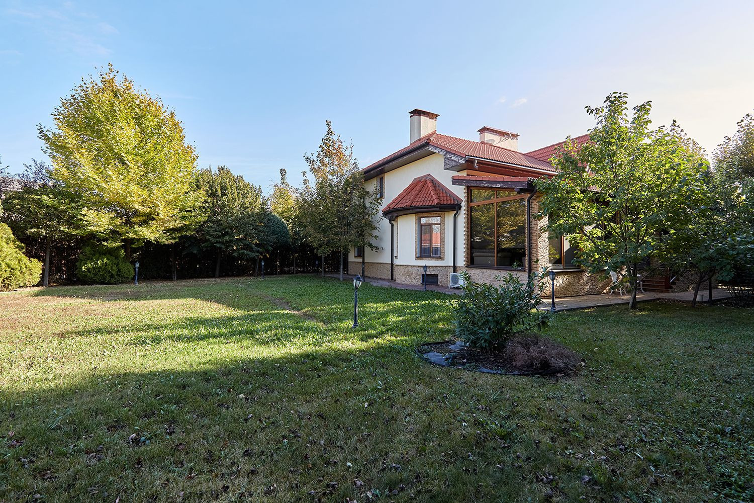 Просторный участок имеет ландшафтный дизайн, по всему периметру высажены туи, дорогие деревья, сосны высотой 5 метров. Летняя терраса с зоной барбекю, мебелью, бассейн с качественной чашей (стоимостью 6 млн. р), вокруг террасная доска. По всей территории газон с системой авто полива.