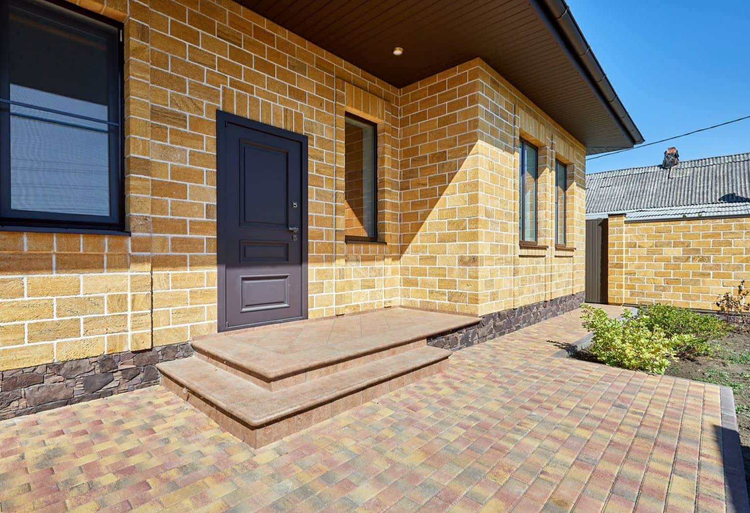 Во дворе, расположена мангальная зона с зоной для отдыха, растут кустарники и декоративные деревья.