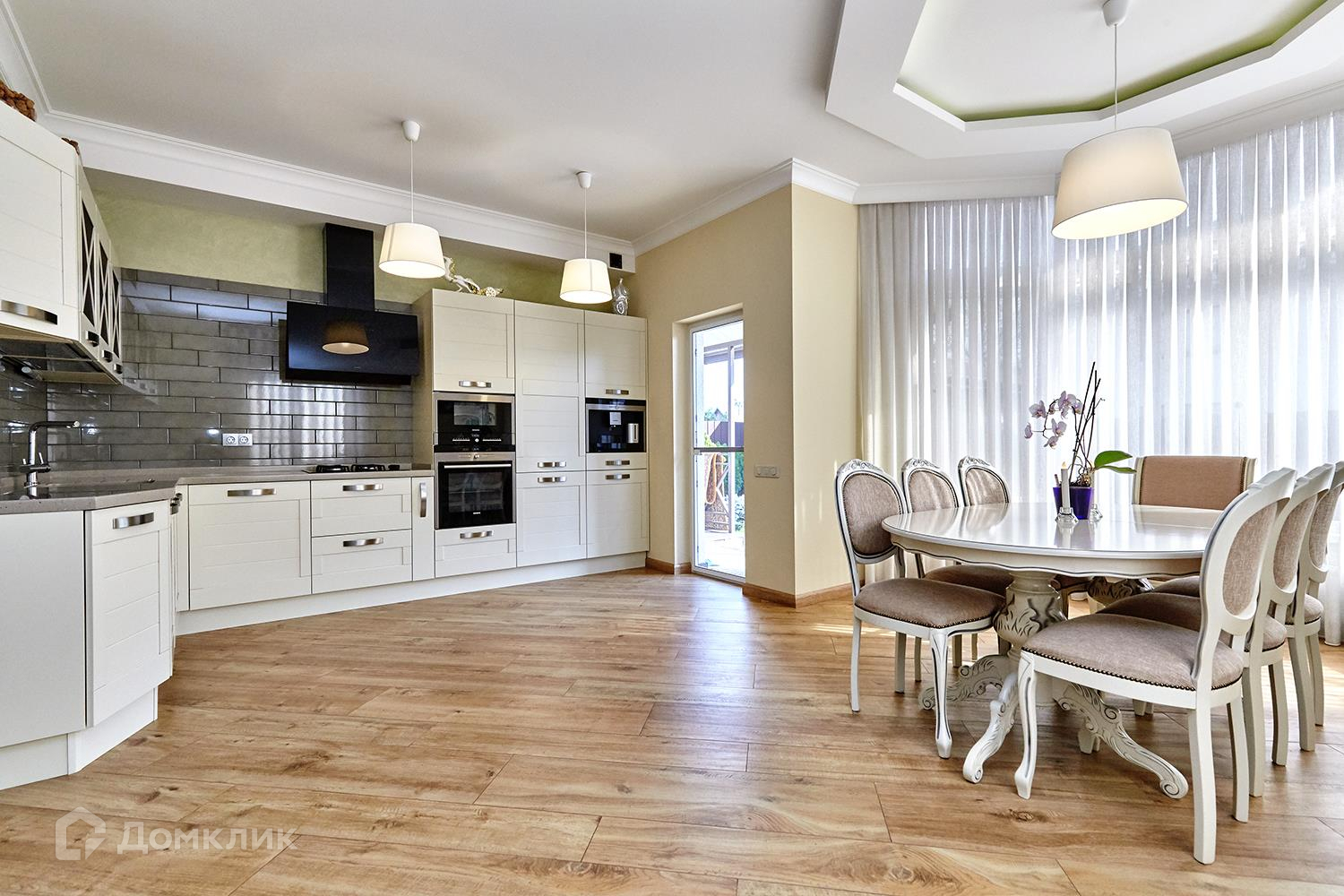 На первом этаже просторный холл со вторым светом, огромная кухня-столовая, гостиная, кладовая, сан.узел и бойлерная. Вся мебель и бытовая техника на кухне от ведущих торговых марок: кухонный гарнитур от фабрики "Дриада", встроенная кофе-машина, духовой шкаф, варочная поверхность, микроволновая печь, вытяжка, посудомоечная машина Siemens.