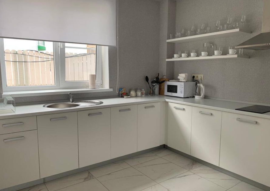 Первый этаж: просторная и светлая кухня-гостиная со встроенной мебелью и техникой, санузел, котельная и прихожая.