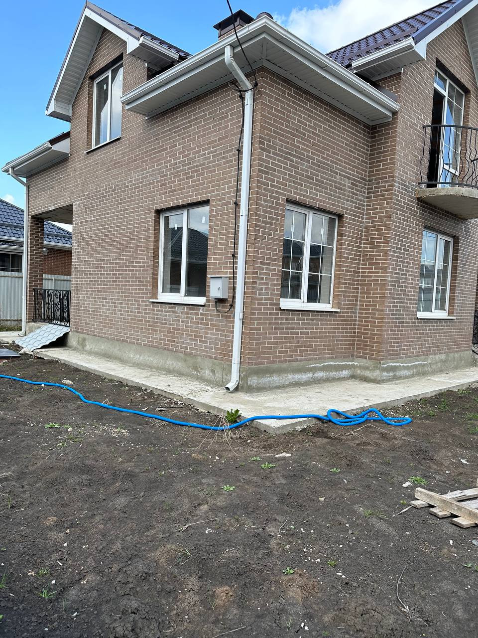 Дом сдается в предчистовой отделке( вытянуты стены (штукатурка, шпатлевка), стяжка пола, полипропиленовые трубы, развод сантехники, радиаторы),теплый пол, разводка электрики. Территория огорожена кирпичным забором, установлены ворота, калитка. Газ по меже. Септик дренажный 9 кв.м. Скважина 38 метров.