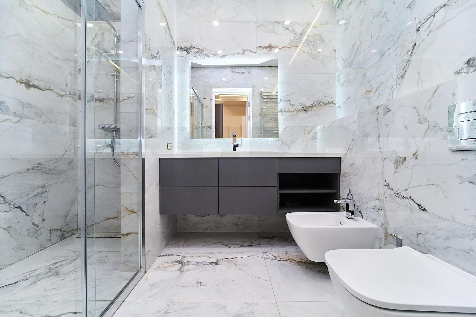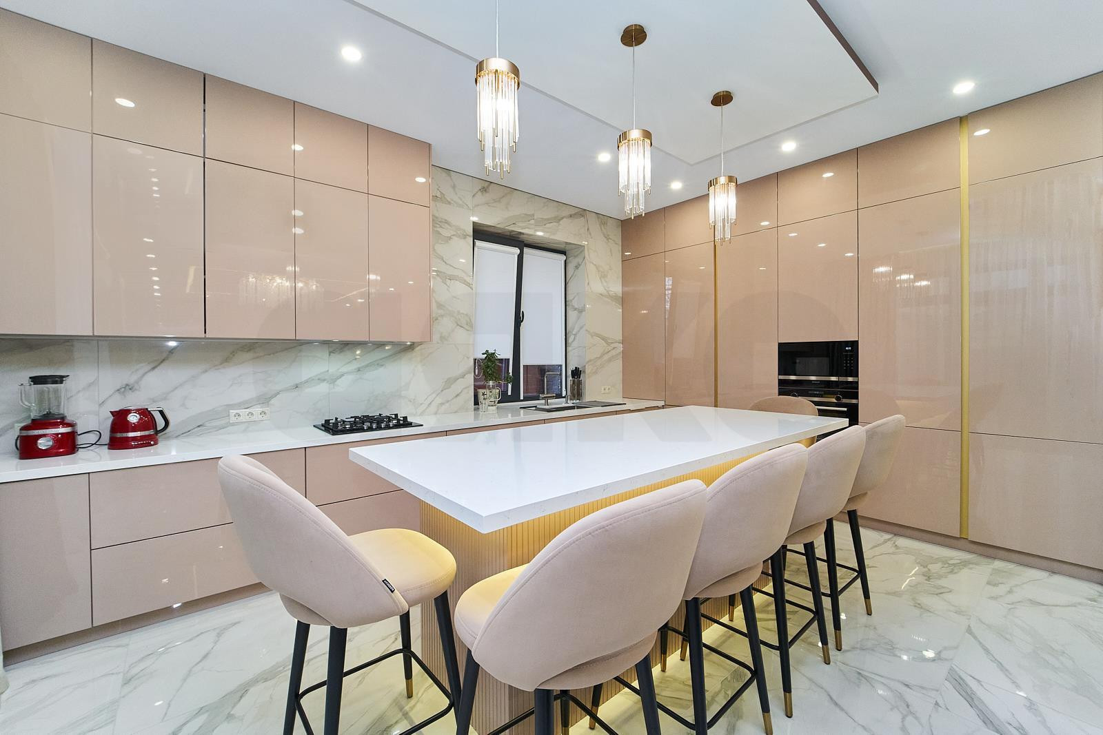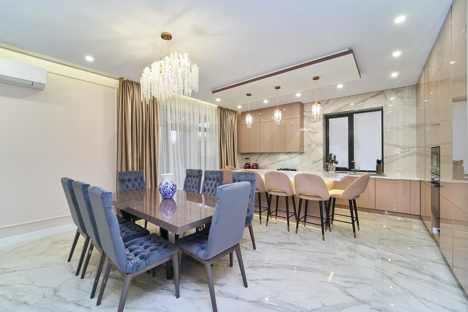 1 этаж: просторная кухня-гостиная 60 м2 с выходом на террасу 50 м2 с теплым полом. Мастер-спальня, кабинет, сан.узел, прачечная-кладовая.