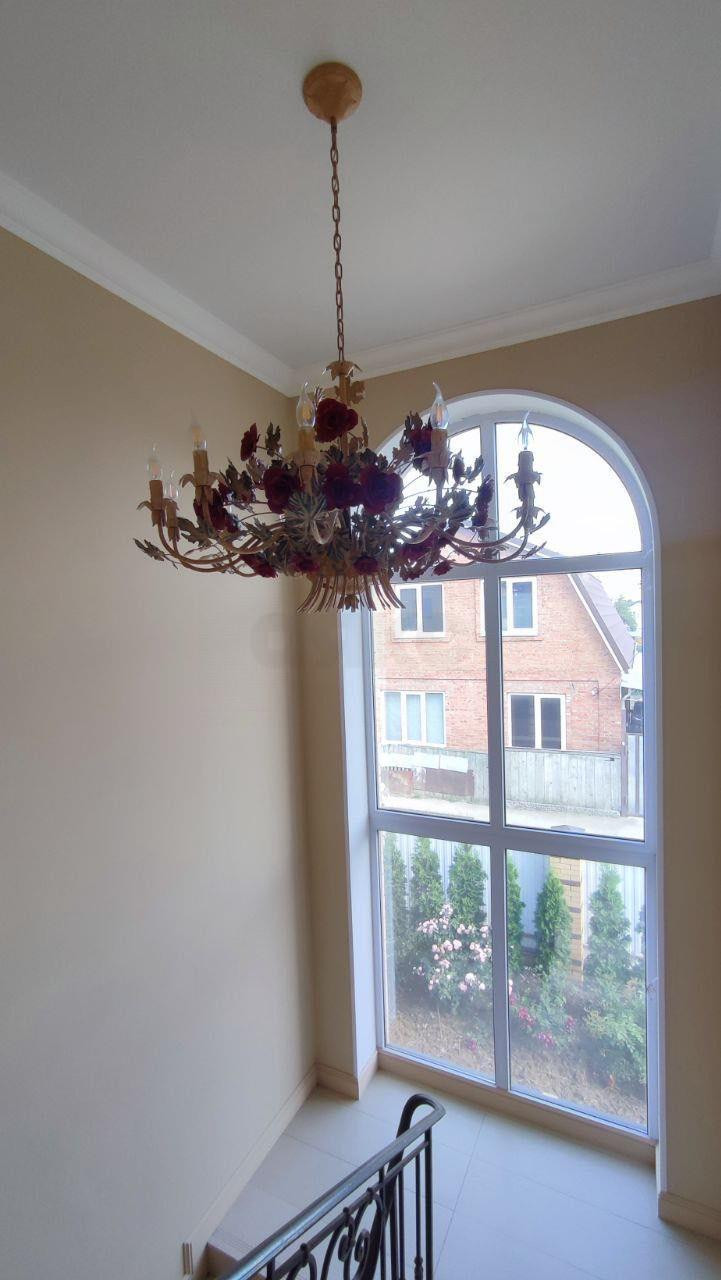 Потрясающая лестница из керамогранита с коваными перилами (ходить по ней - одно удовольствие) - еще одно украшение дома. В центре площадки панорамное окно и безумно красивая люстра итальянских мастеров Раssеri Intеrnаtiоnаl и бра освещают дом и добавляют тепло и уют.