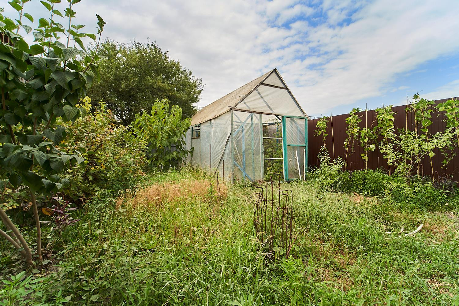 Участок угловой, с двумя въездами. Коммуникации все центральные ( вода, газ, канализация). На территории есть дом 50 кв.м. Материал: саман-кирпич. гараж, хоз.постройки. Есть взрослые плодовые деревья и место для огорода.