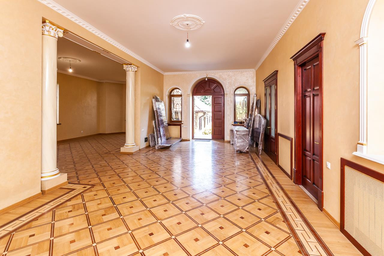 В доме выполнен ремонт в нейтральных тонах итальянской  декоративной штукатурки . На полу везде паркет в идеальном состоянии. Дом с цоколем, цоколь отремонтирован и сухой. Газ центральный. Семь комнат ,два сан.узла.