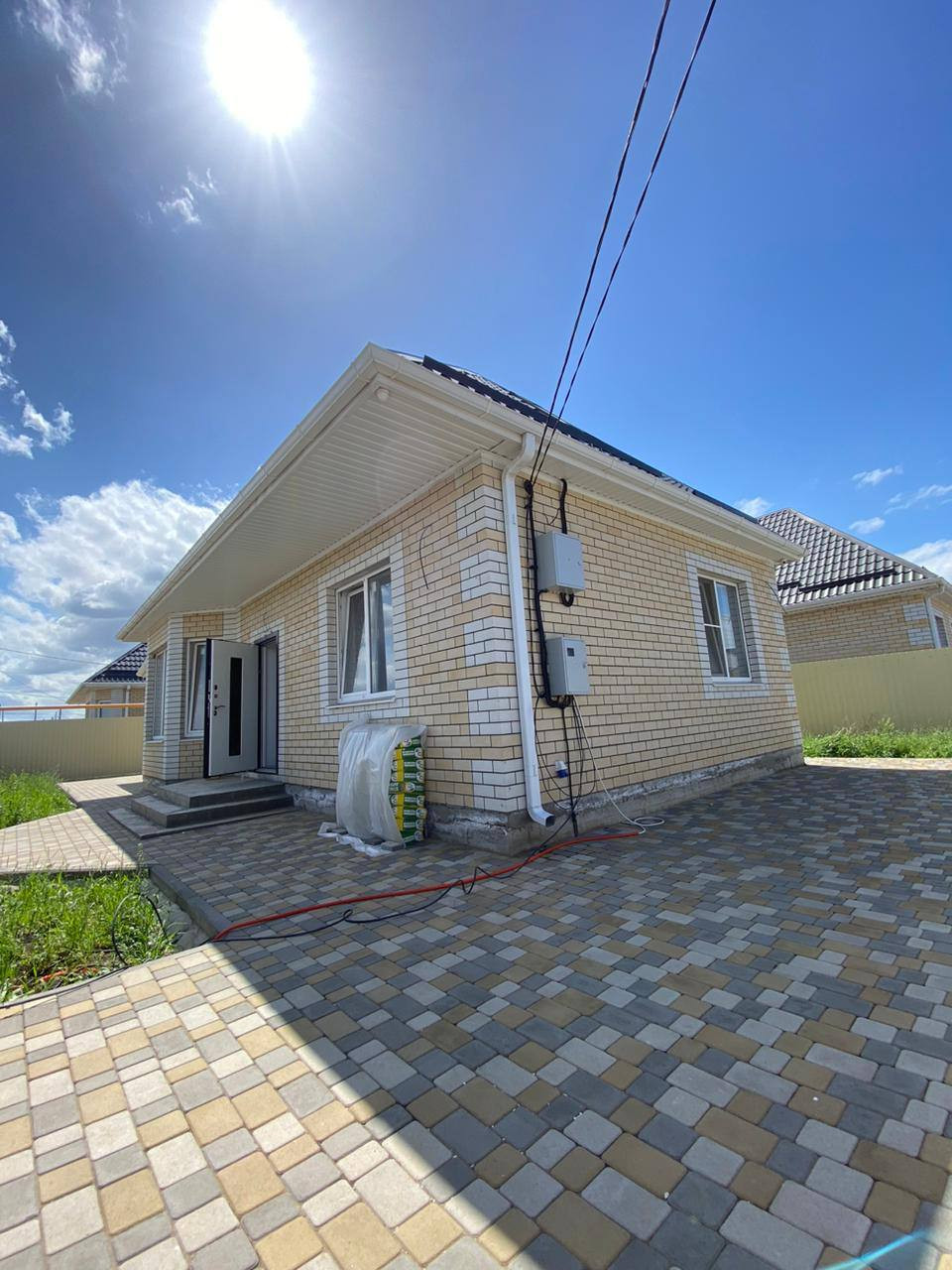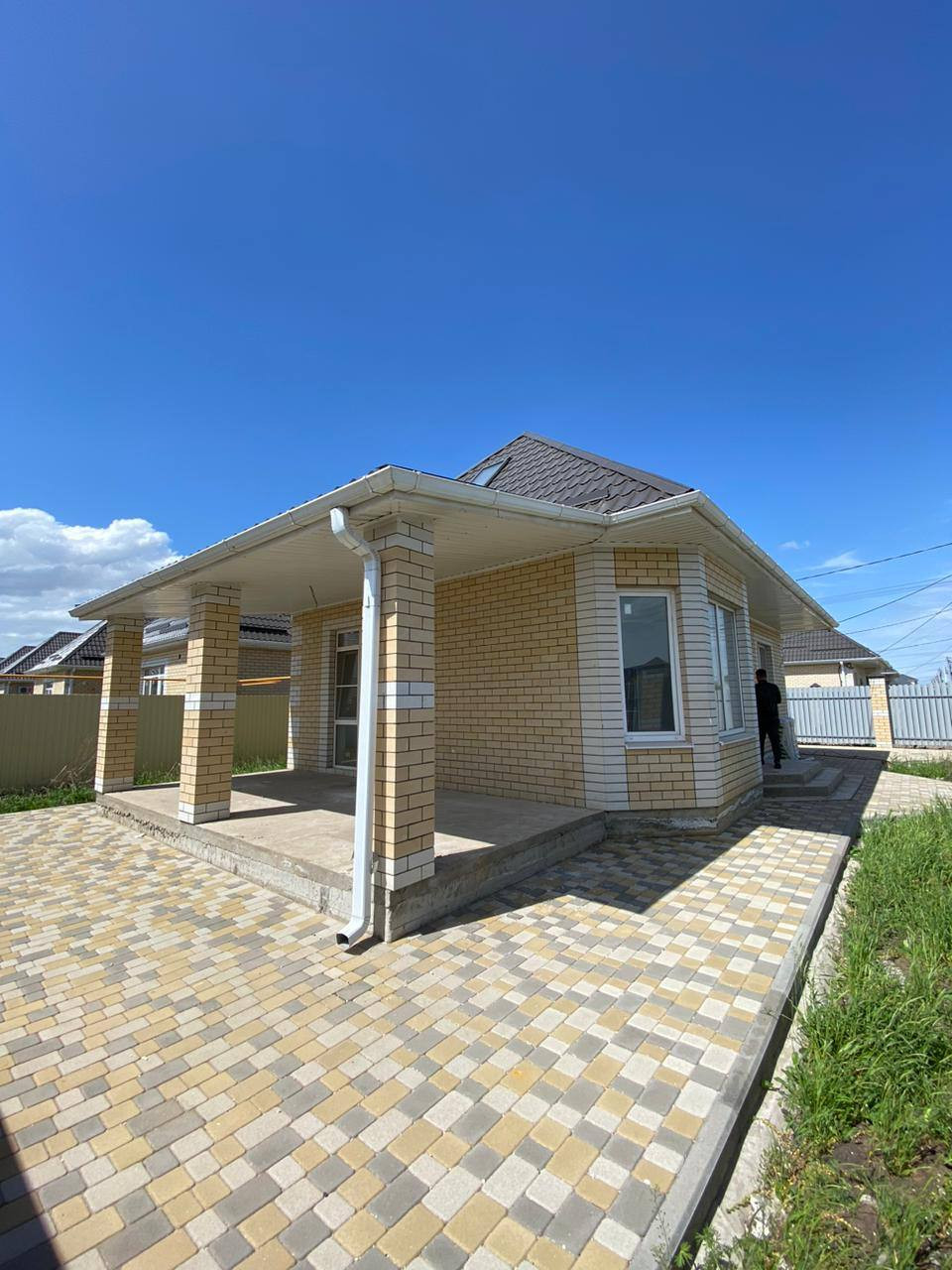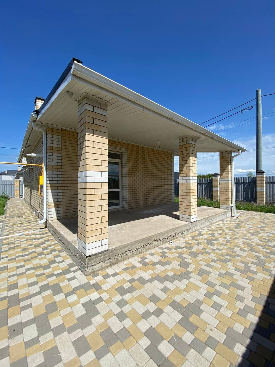 Участок правильной формы, сделана отмостка по периметру дома, есть место под заезд двух машин. Забор из качественного профнастила с колоннами , ворота ролетные – автоматические . Облицован дом керамическим кирпичом. Большая придомовая территория. Сделана крытая терраса, двор в плитке.