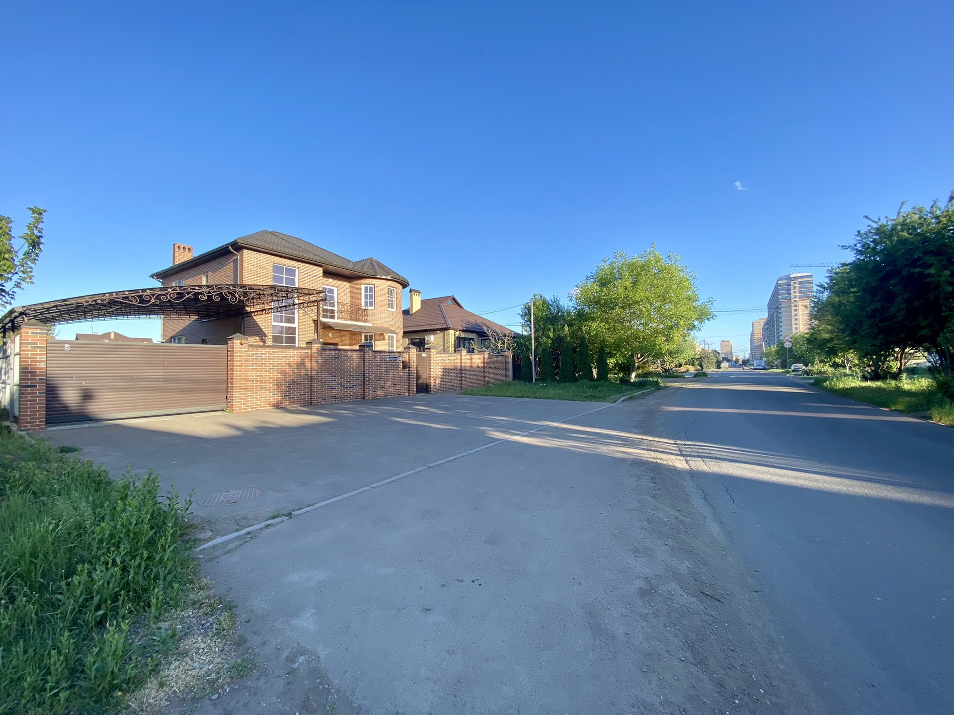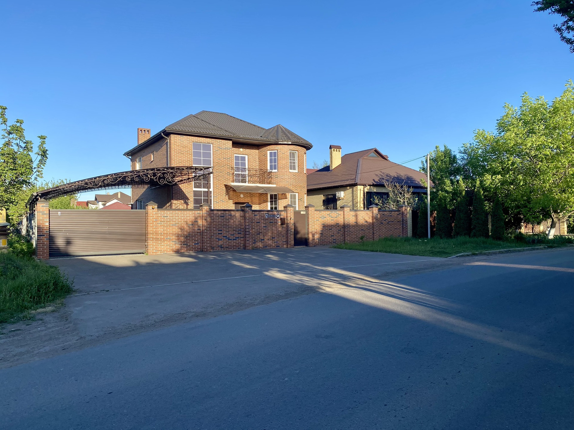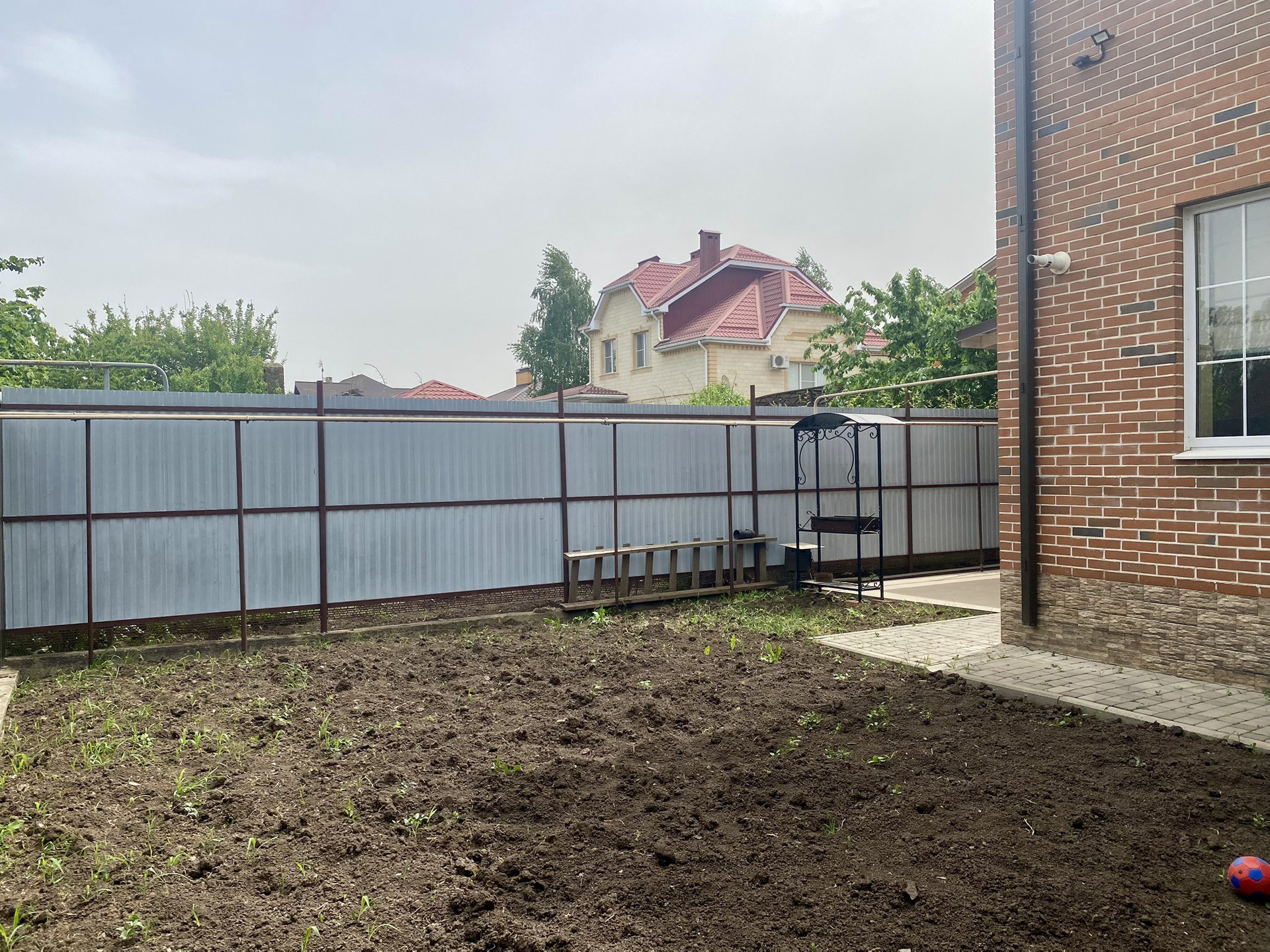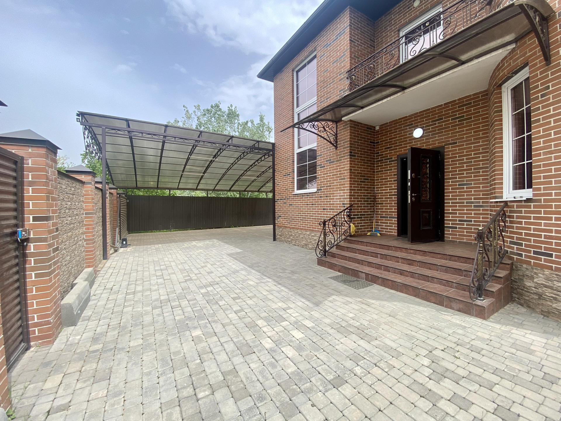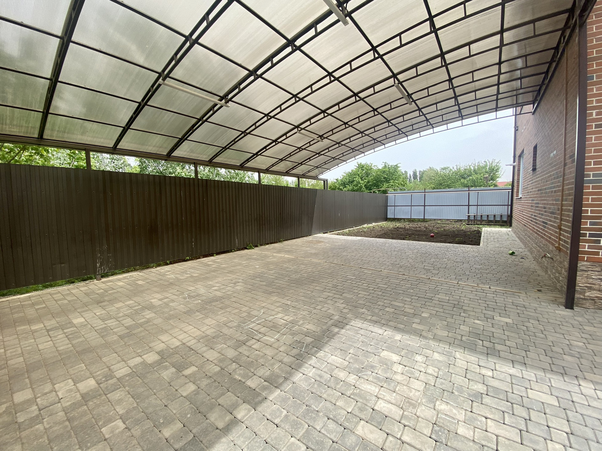 Благоустроенный участок 4 сотки. Кирпичный забор. Во дворе тротуарная плитка, навес, веранда, хозяйственный блок, большая беседка.