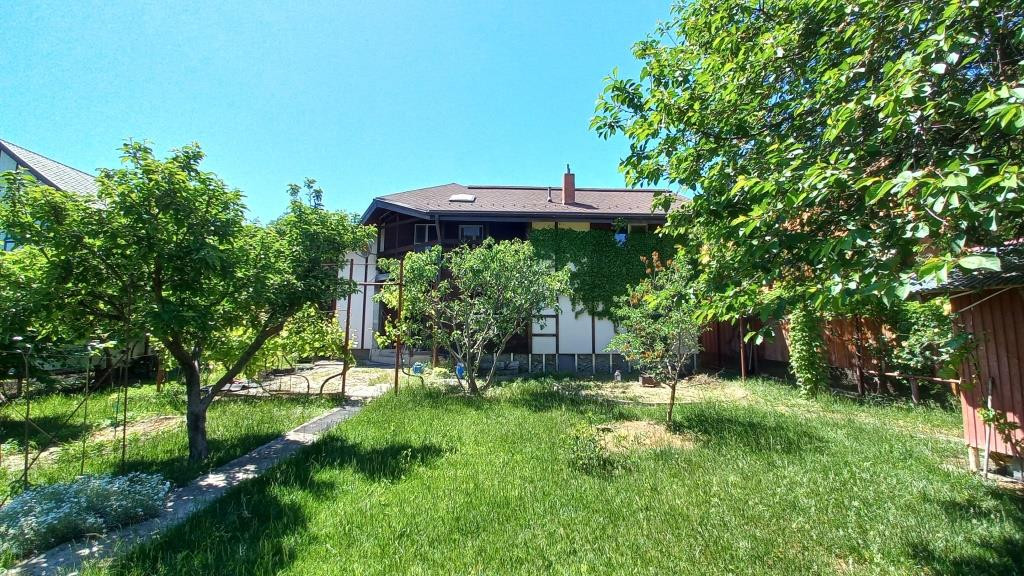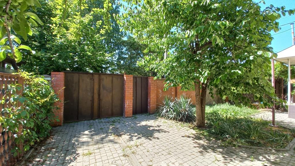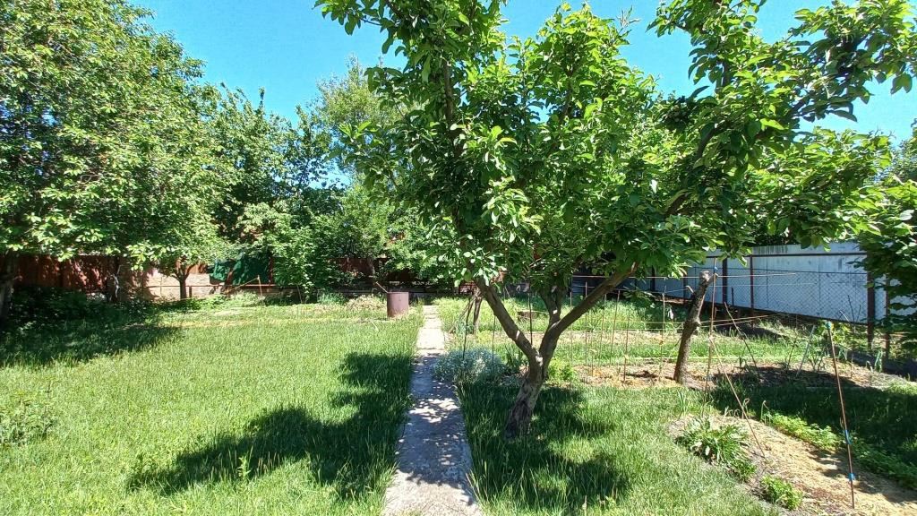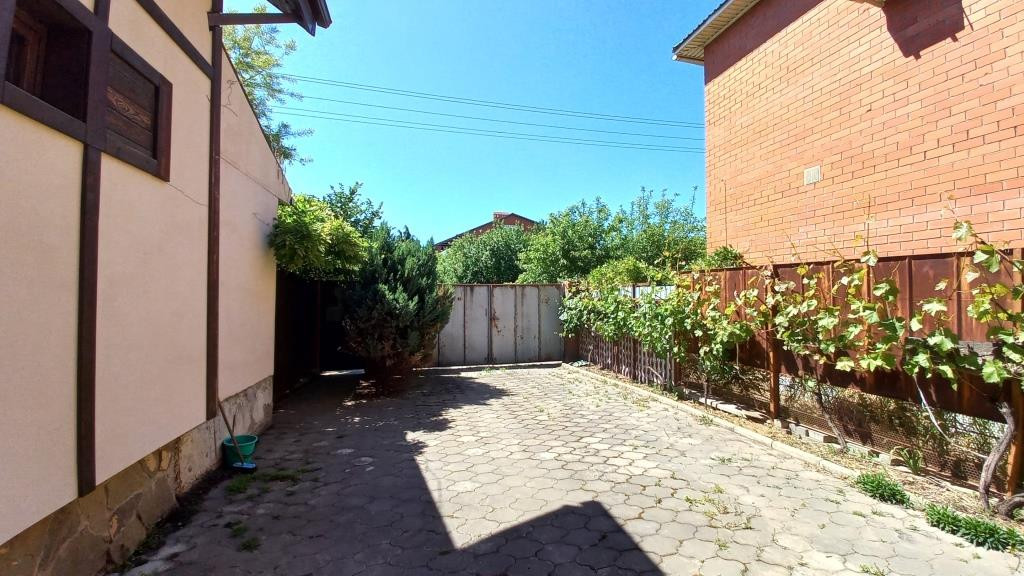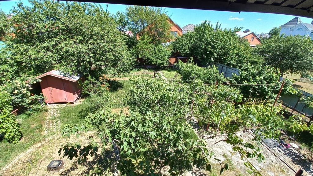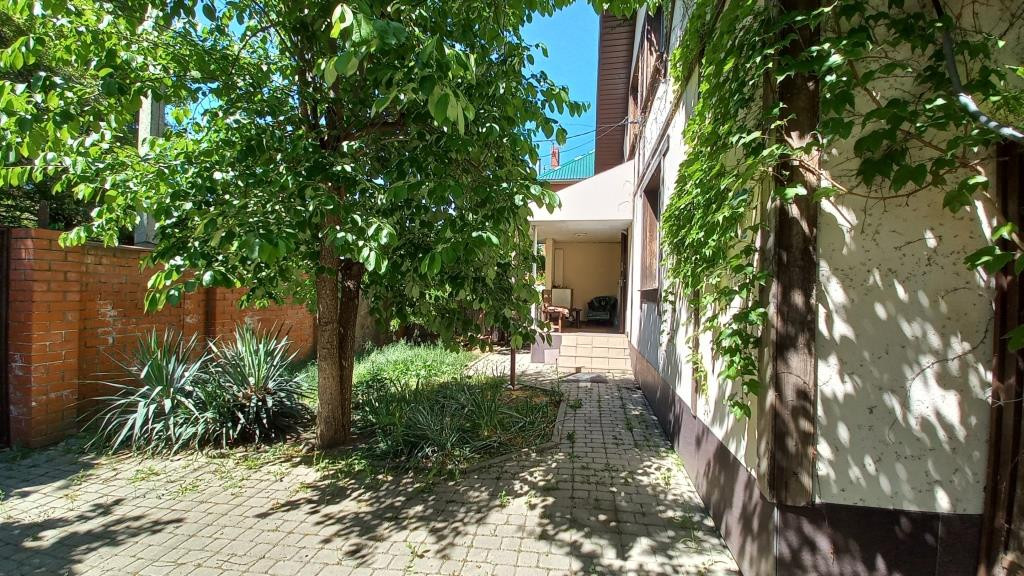 Двор вымощен плиткой. На территории растёт много фруктовых деревьев и кустарников. Есть огород.
