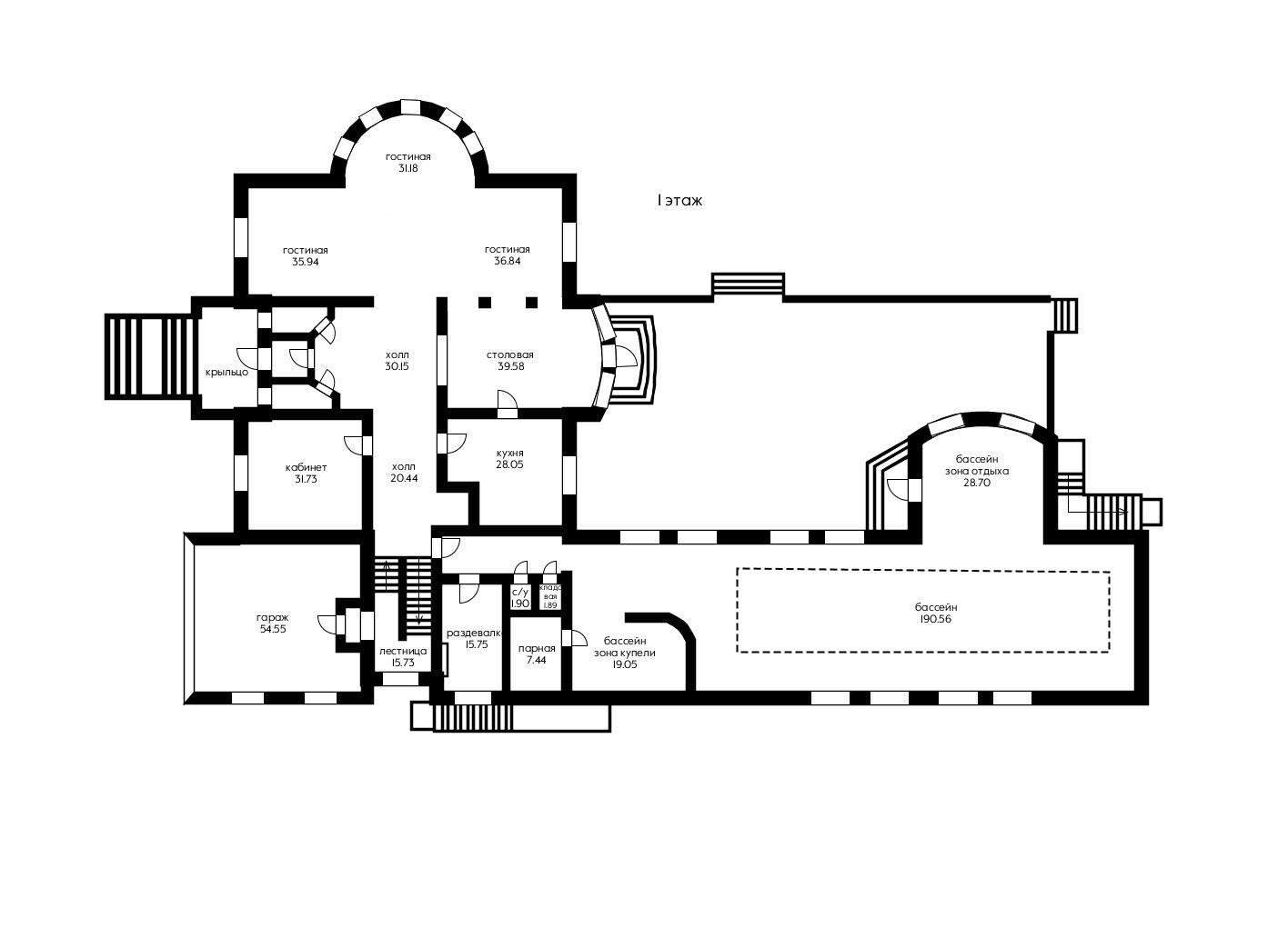 На втором этаже расположены четыре комнаты, каждая из которых имеет отдельный санузел и гардеробную. В спальне для взрослых предусмотрены две зоны: большая гардеробная и санузел. В цокольном этаже находятся кинотеатр, кабинет и зона для обслуживающего персонала с отдельным входом.