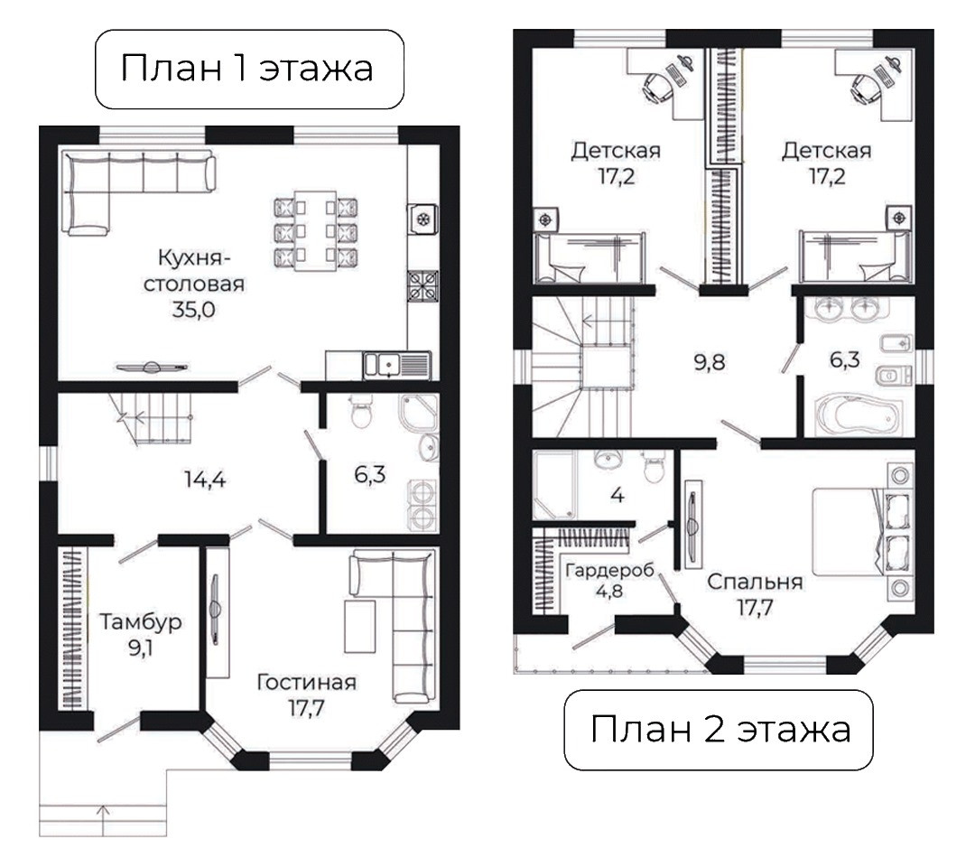 - 2 детских комнаты с продуманной зоной хранения по 17.2м² каждая