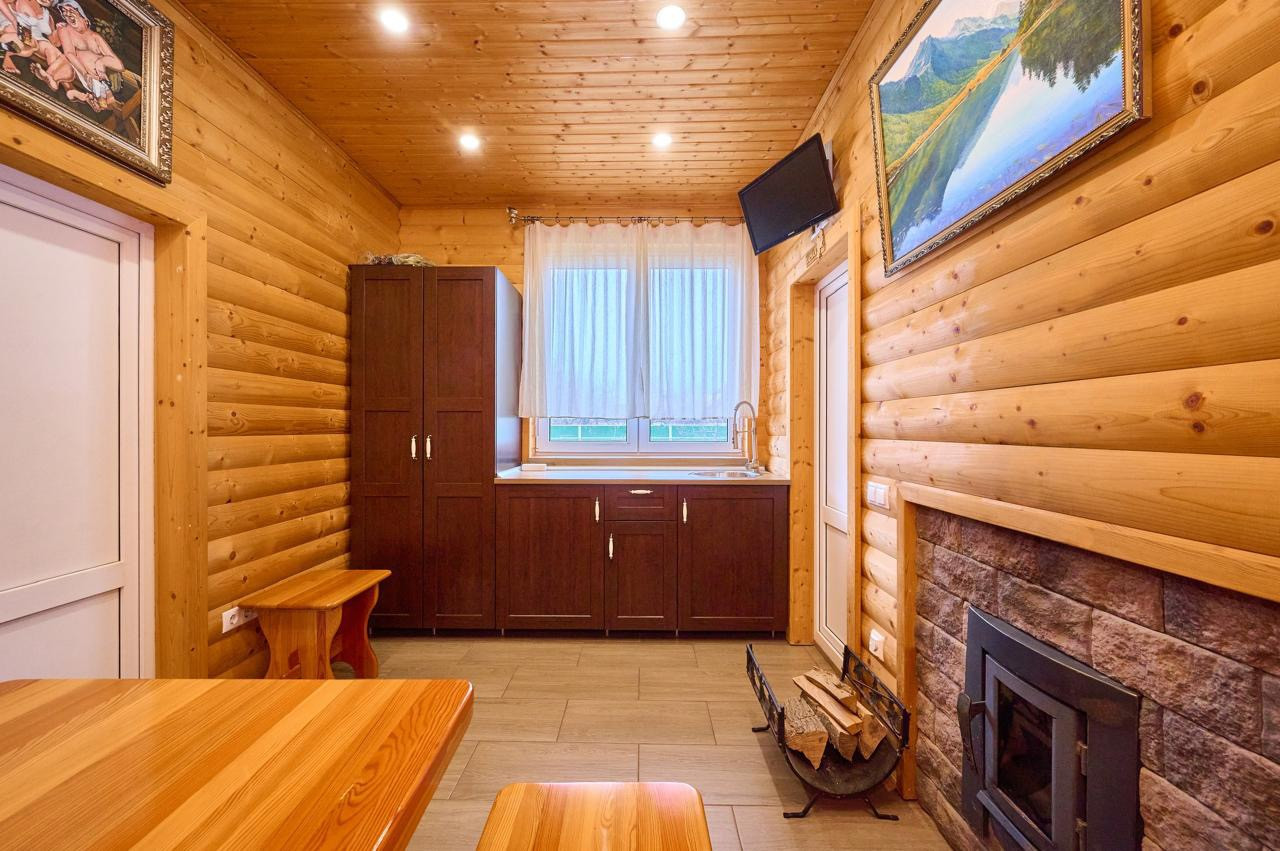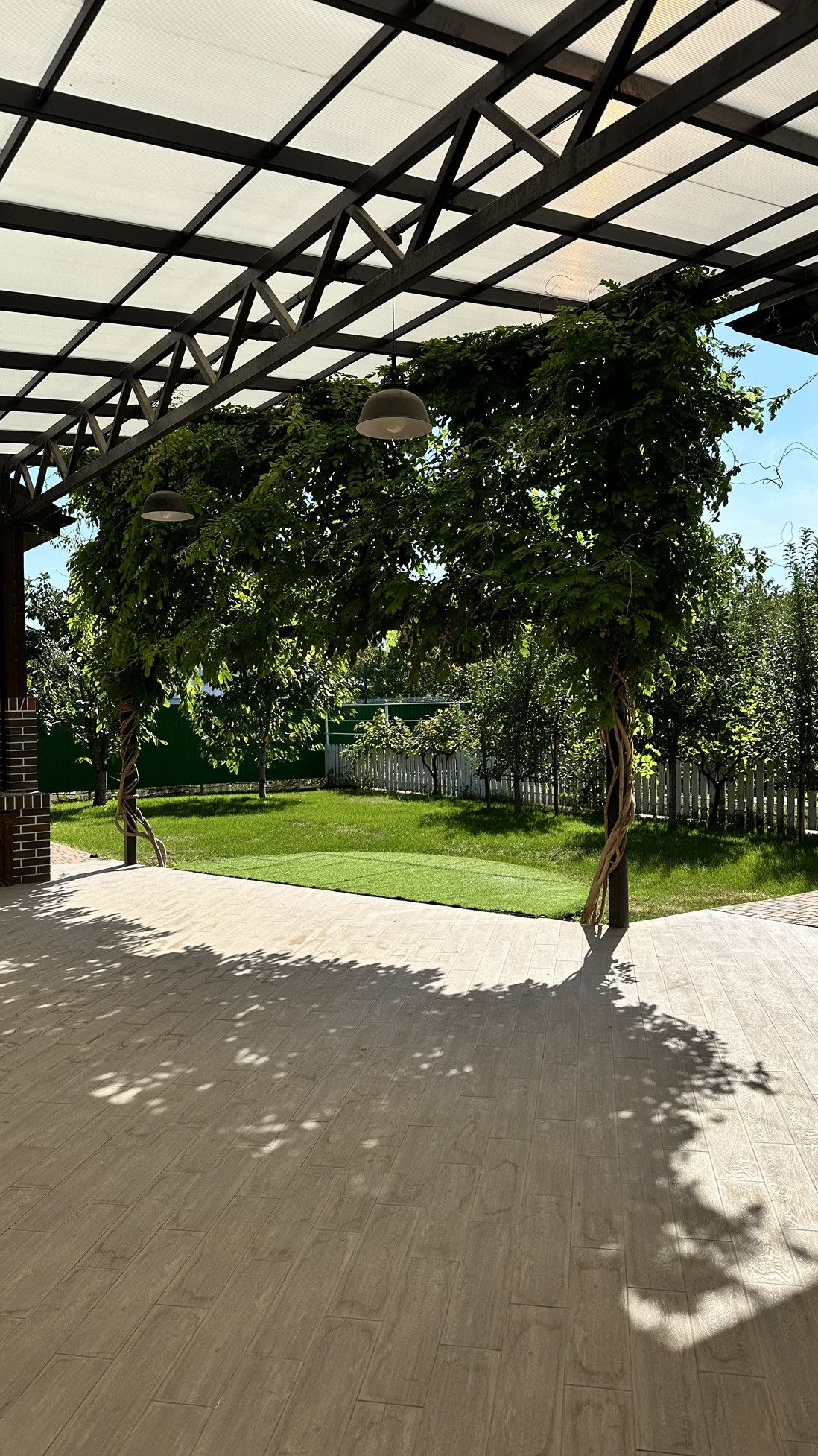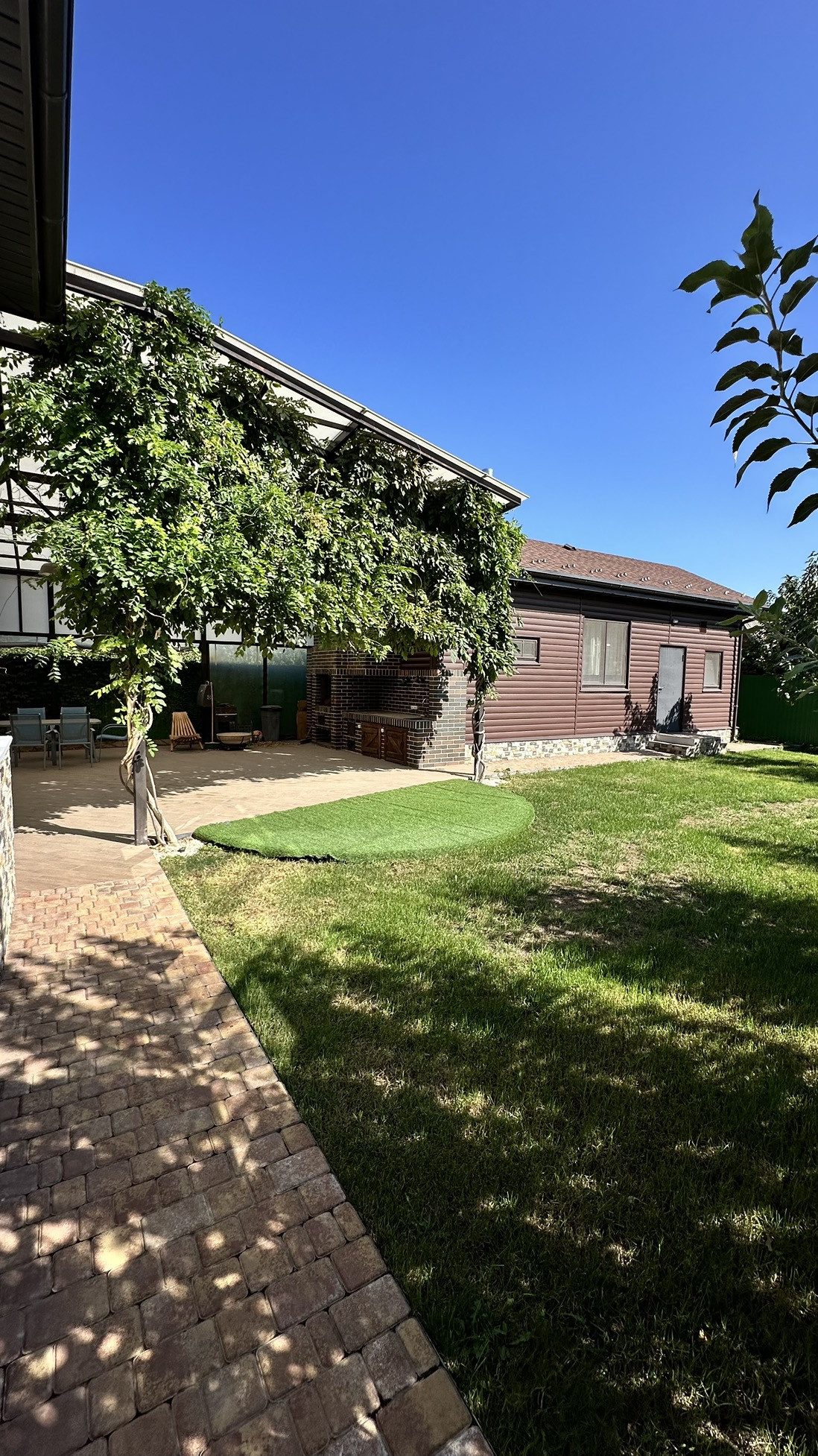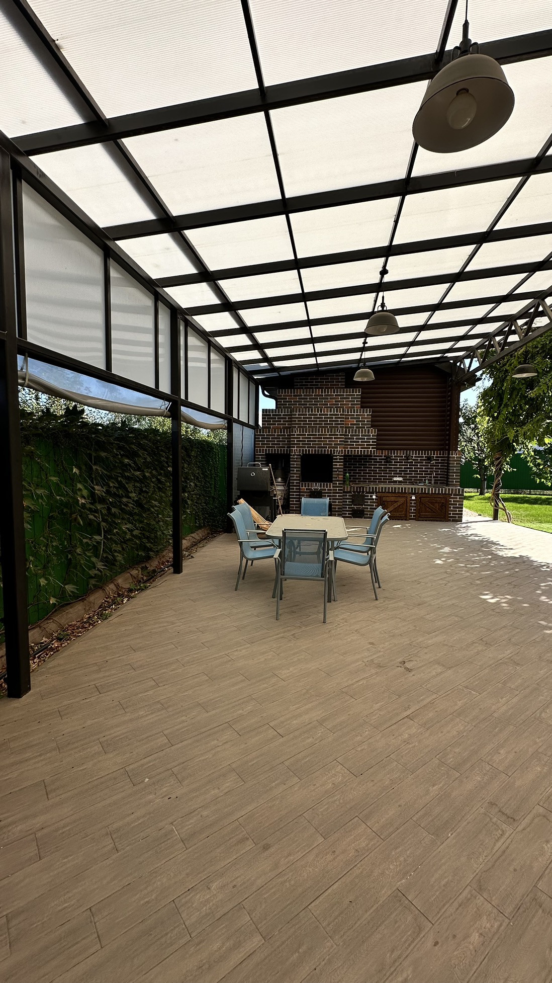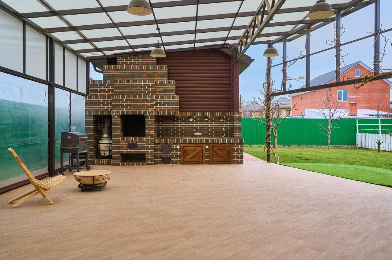 Мангальная зона крытая, есть печь под тандыр и казан. Здесь же оборудовано место для размещения каркасного бассейна.