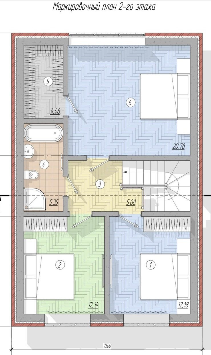 На втором этаже — холл, санузел, три изолированные комнаты, мастер-спальня с гардеробной.