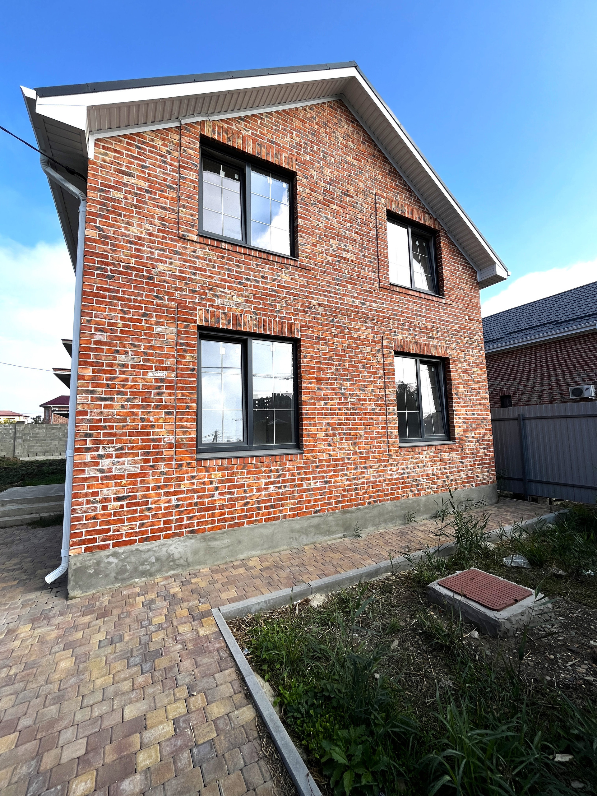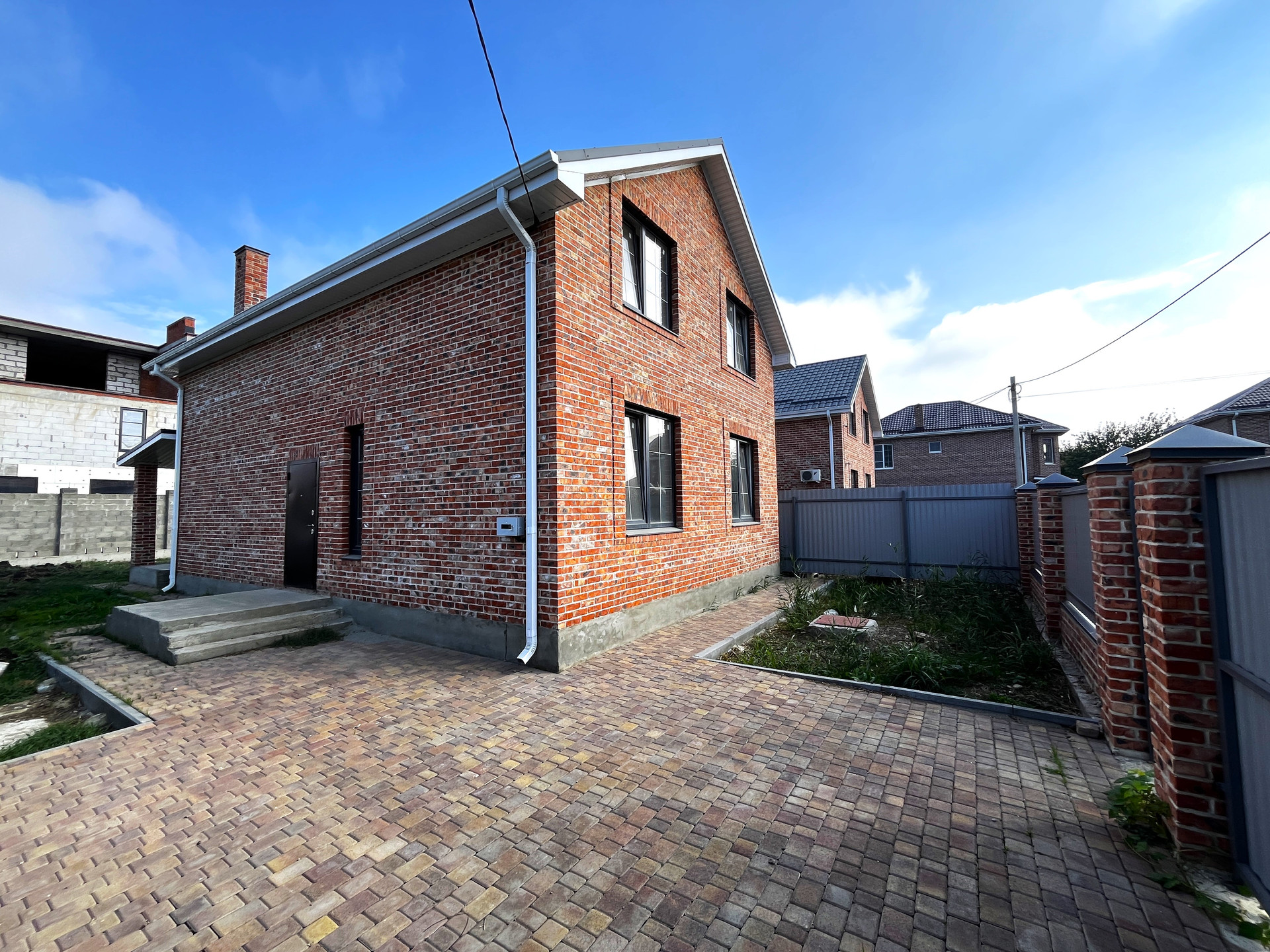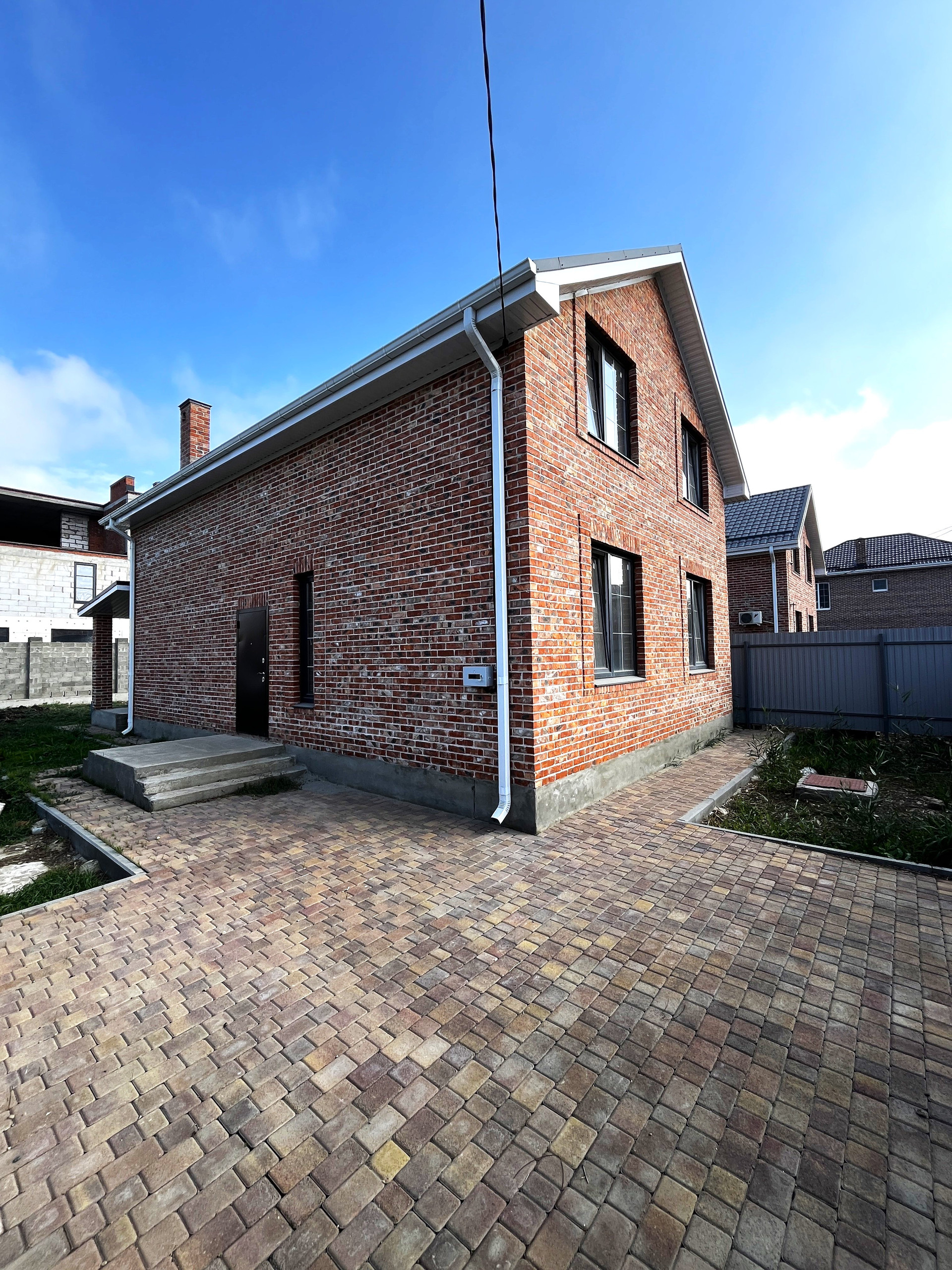 Двор забетонирован, выложен плиткой, паркоместа для автомобилей, на заднем дворе терраса, есть возможность обустроить зону барбекю, высадить фруктовые деревья и кустарники.