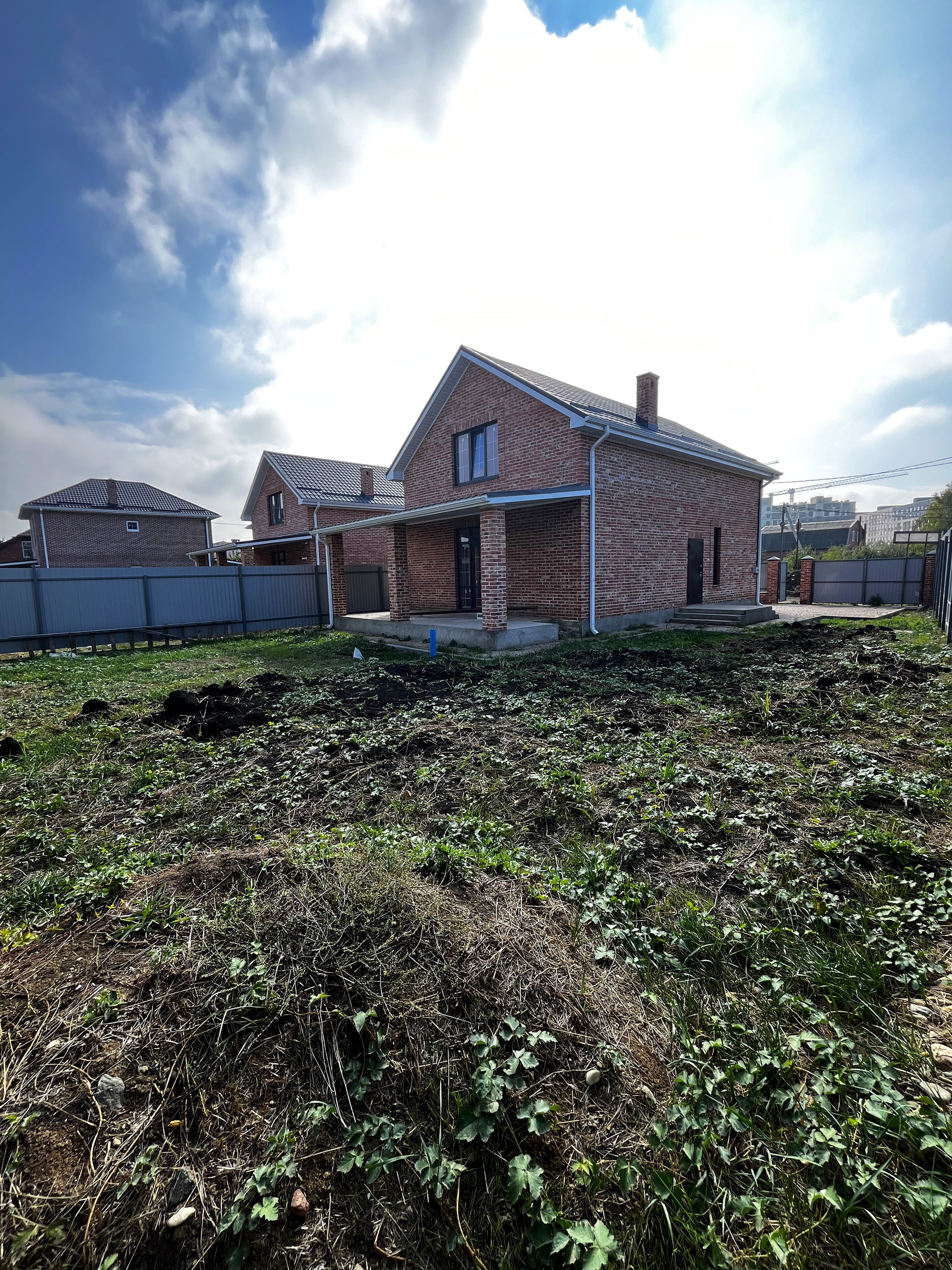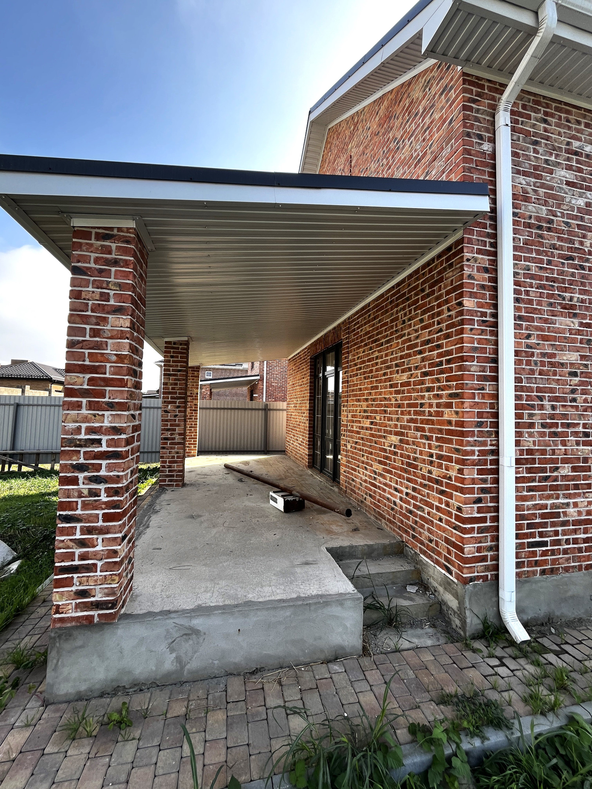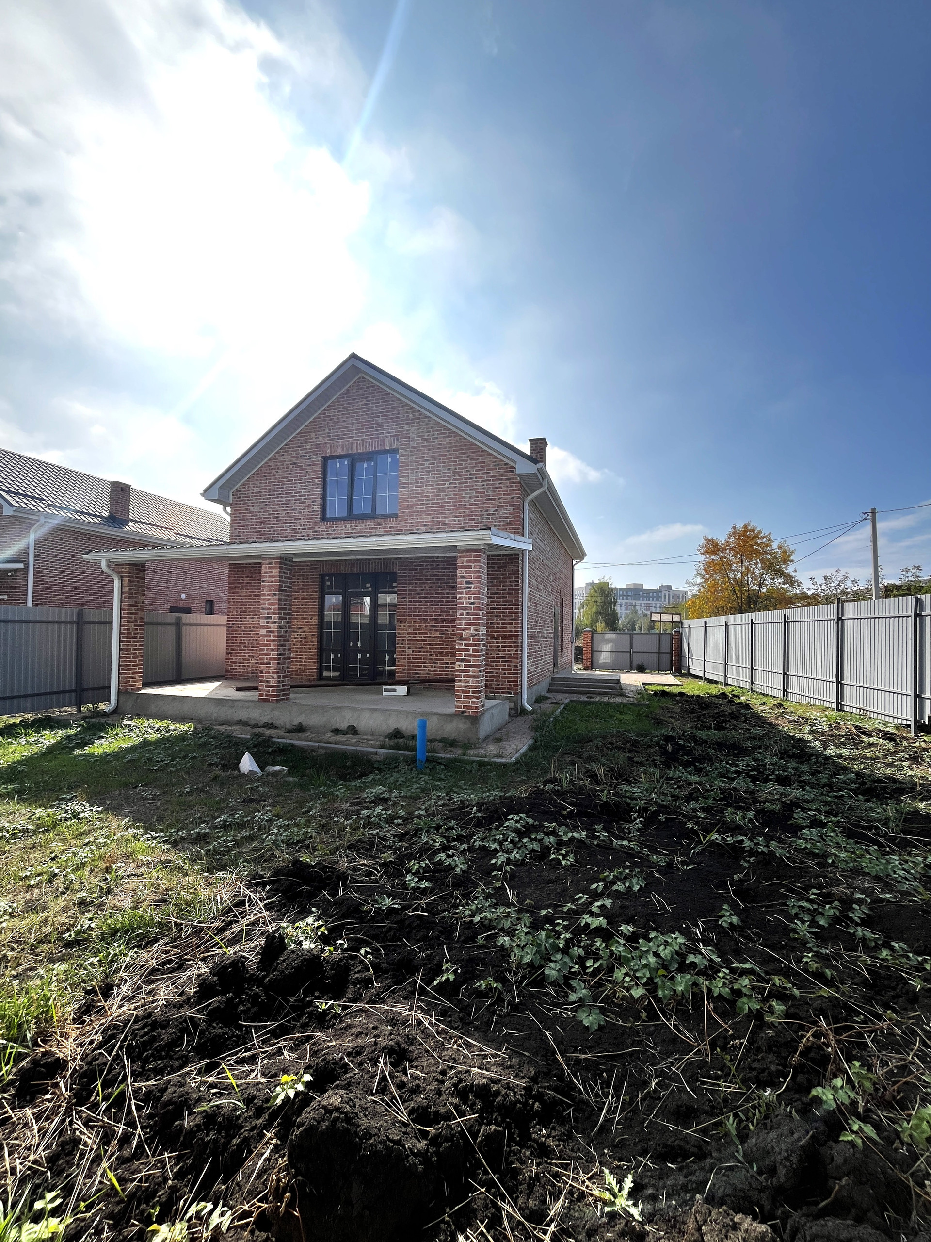Двор забетонирован, выложен плиткой, паркоместа для автомобилей, на заднем дворе терраса, есть возможность обустроить зону барбекю, высадить фруктовые деревья и кустарники.