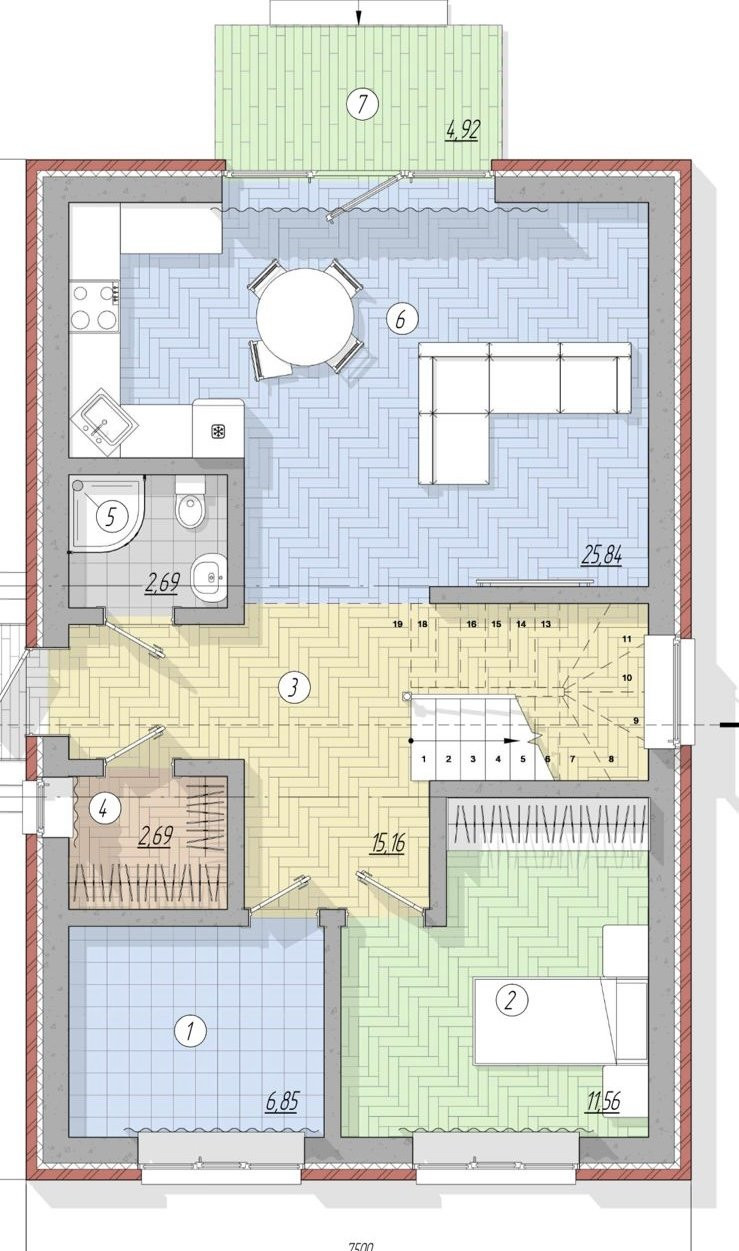 Коттедж общей площадью 140 кв.м. комфортной для проживания планировки: на первом этаже — прихожая, холл, гардеробная, две изолированные комнаты (гостевая спальня и кабинет), совмещенный санузел, под лестницей можно организовать системы хранения, кухня-гостиная с выходом на крытую террасу, монолитная лестница на второй этаж.
