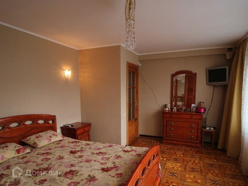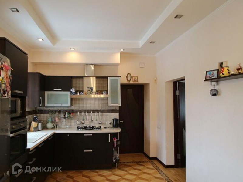 На первом этаже находится санузел, облицованный плиткой. Просторная кухня оборудована встроенной мебелью и имеет выход на террасу. В доме также имеется 4 спальни. В жилых комнатах и на кухне на полу уложен паркет, а потолки выполнены из гипсокартона и натяжного полотна в гостиной комнате.